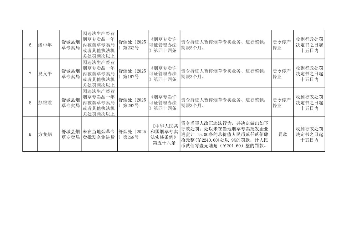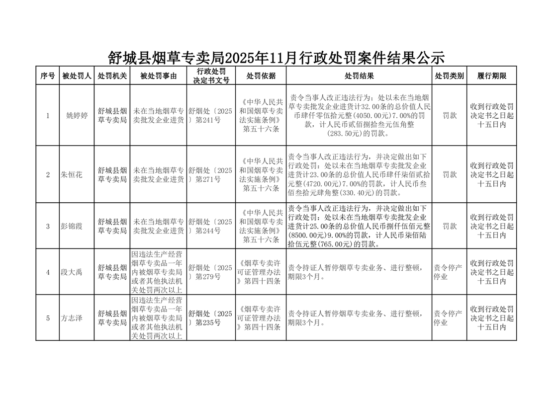 舒城县烟草专卖局2025年11月行政处罚案件结果公示