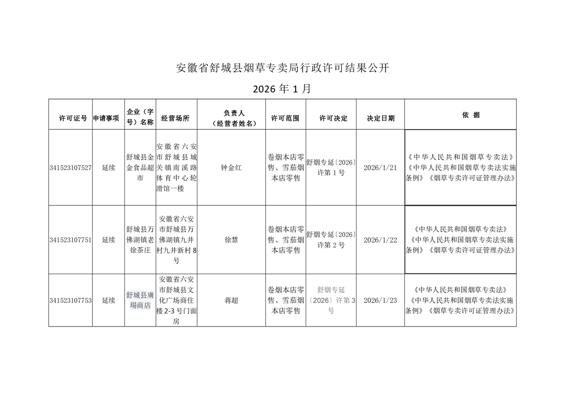 安徽省舒城县烟草专卖局行政许可结果公开2026年1月(1-23日) 延续公示