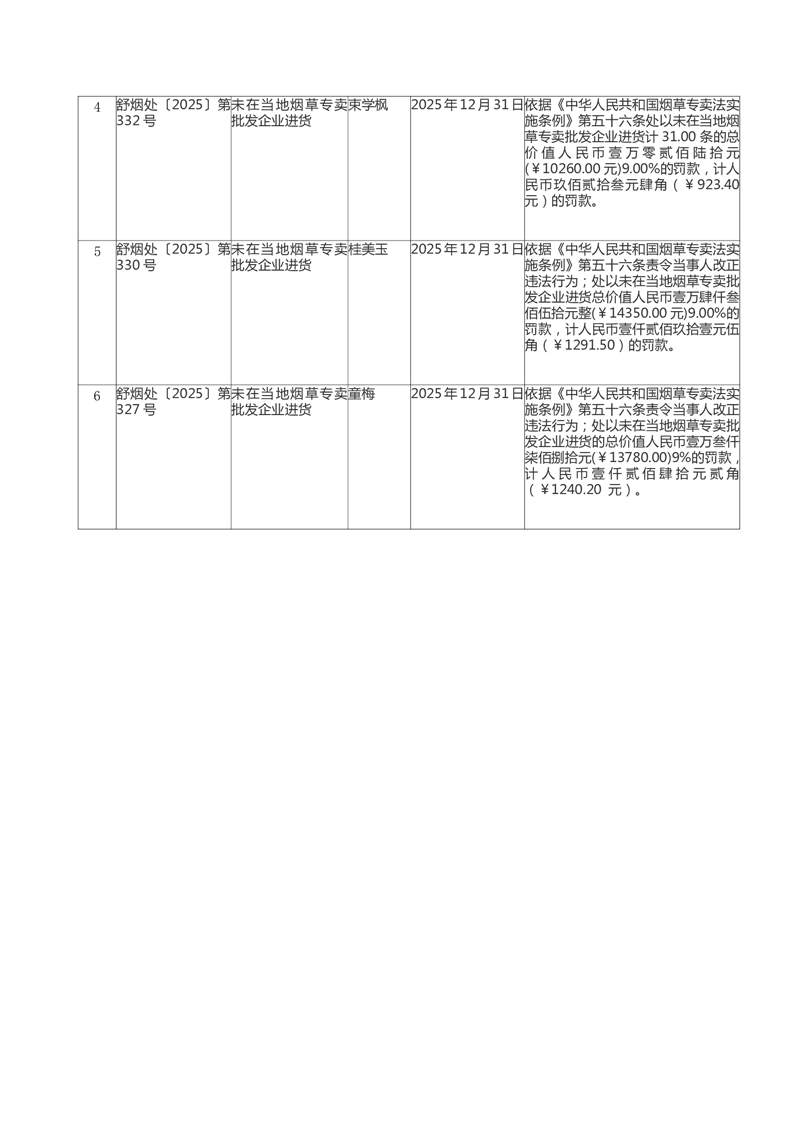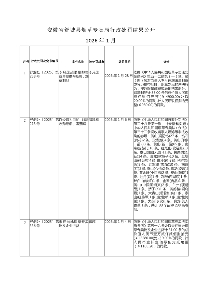 安徽省舒城县烟草专卖局行政处罚结果公开(2026.1)