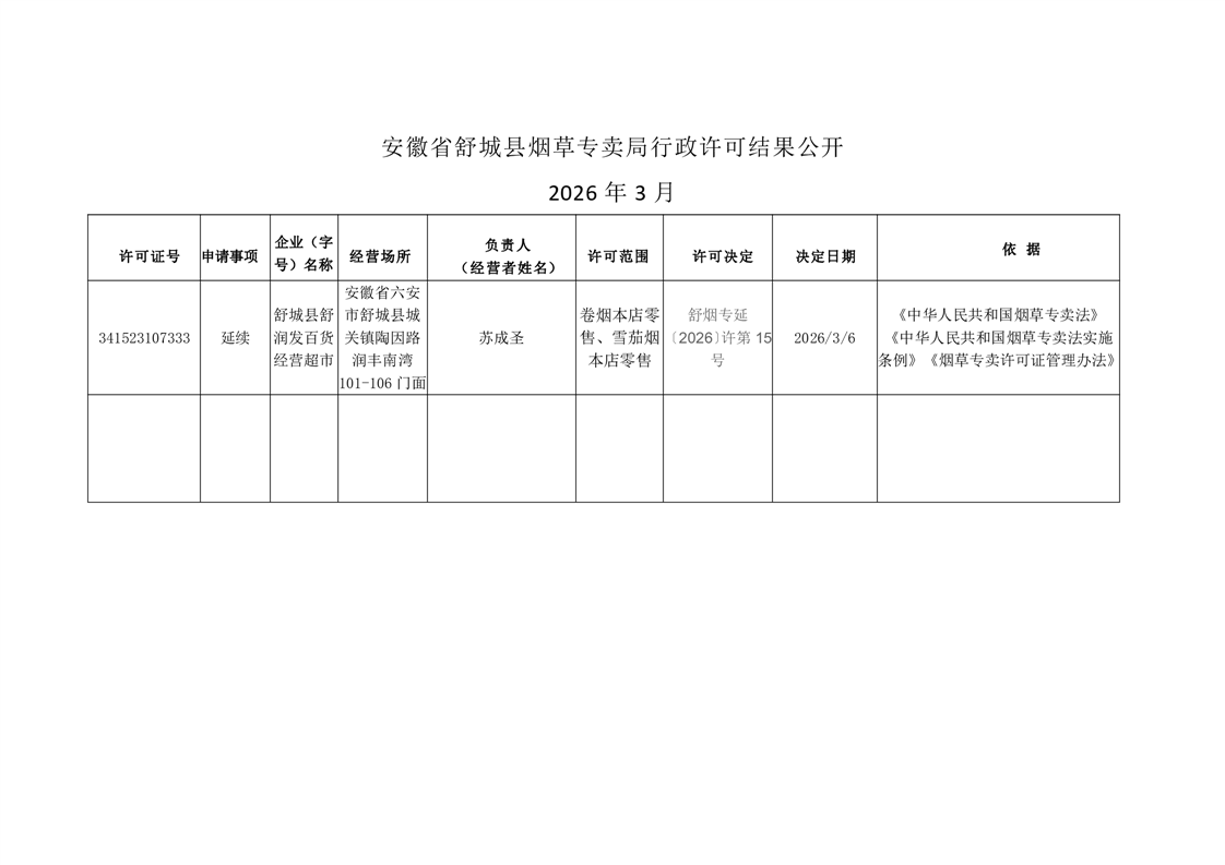安徽省六安市舒城县烟草专卖局行政许可结果公开2026年3月(2日-6日) 延续公示