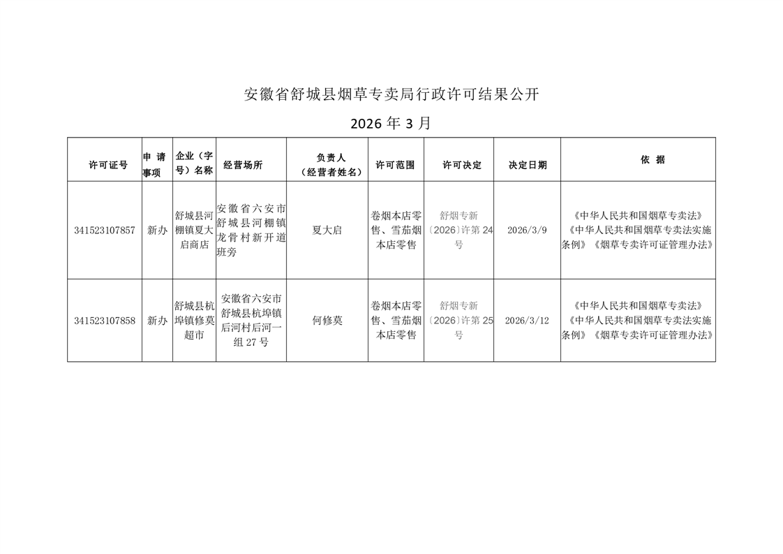 安徽省六安市舒城县烟草专卖局行政许可结果公开2026年3月(9日-13日) 新办证公示