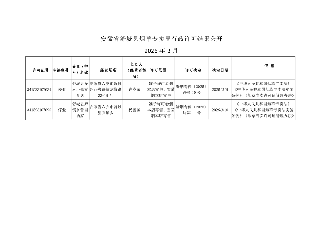 安徽省六安市舒城县烟草专卖局行政许可结果公开2026年3月(9日-13日)停、歇业、收回、注销户公示