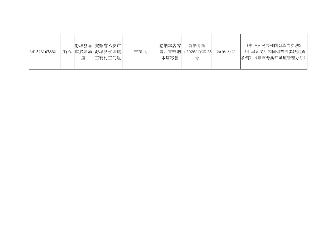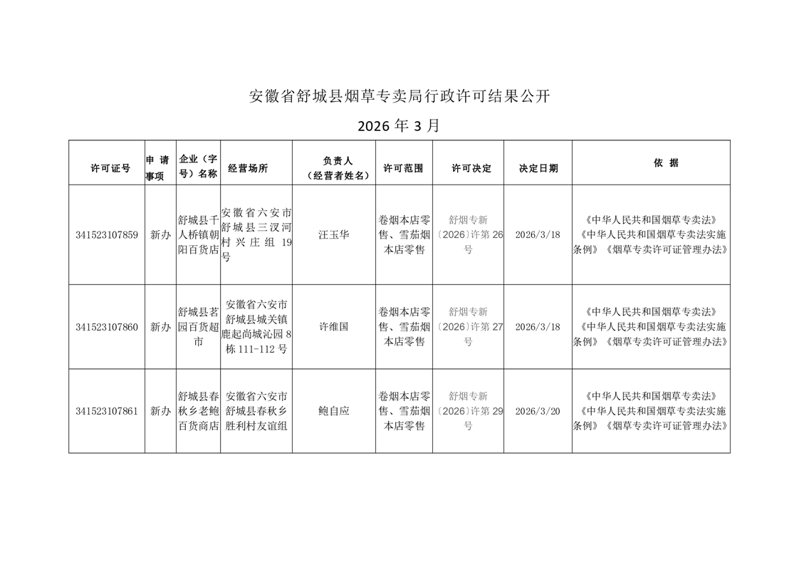 安徽省六安市舒城县烟草专卖局行政许可结果公开2026年3月(16日-20日) 新办证公示