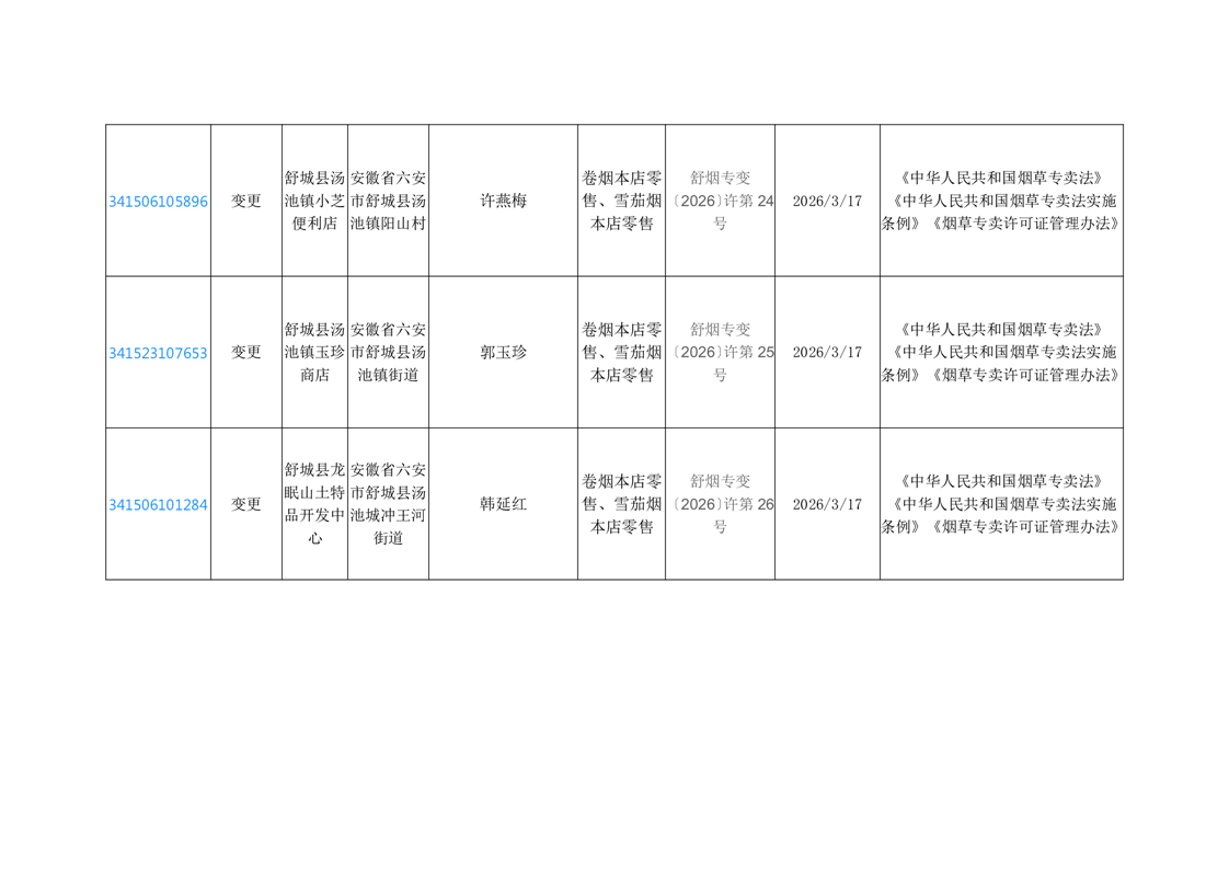 安徽省六安市舒城县烟草专卖局行政许可结果公开2026年3月(16-20日) 变更公示