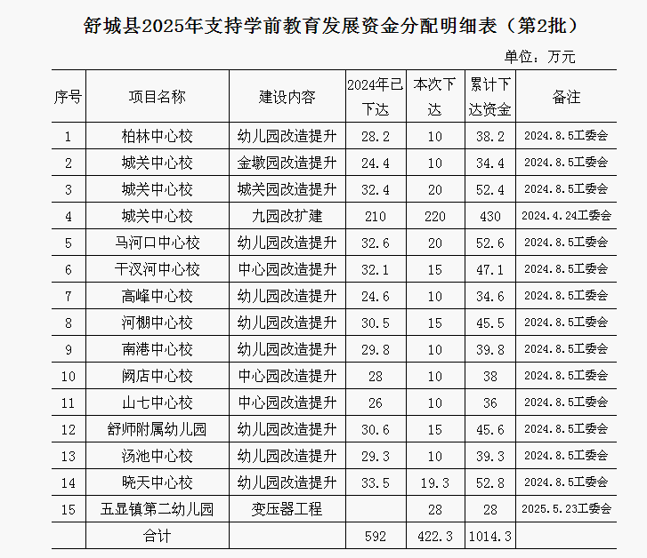 舒城县2025年支持学前教育发展资金分配明细表(第2批)