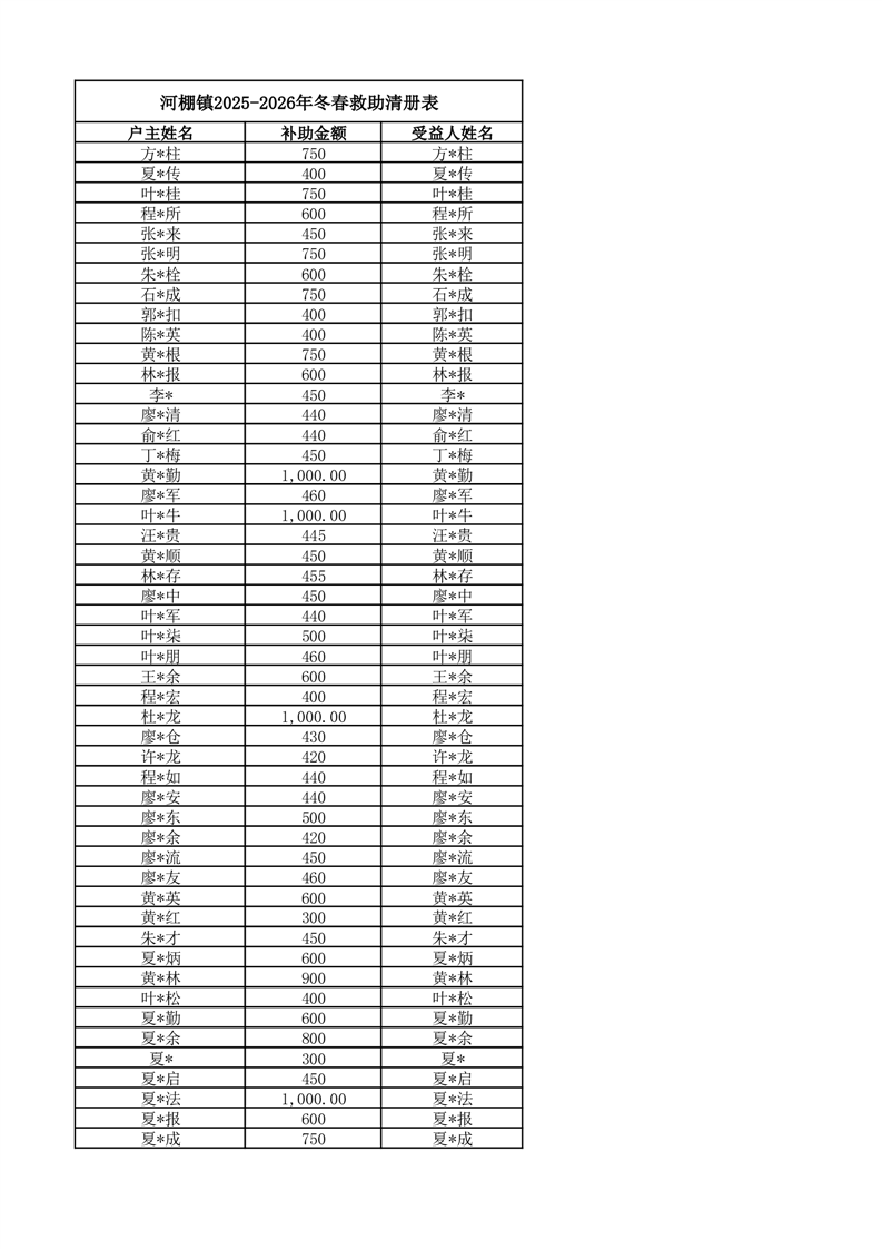 河棚镇2025-2026年冬春救助发放清册表