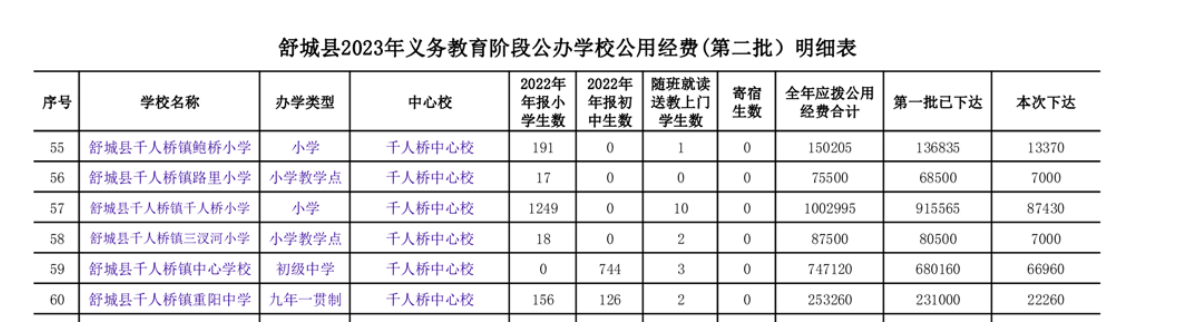 舒城县千人桥镇2023年义务教育阶段公办学校公用经费(第二批)明细表