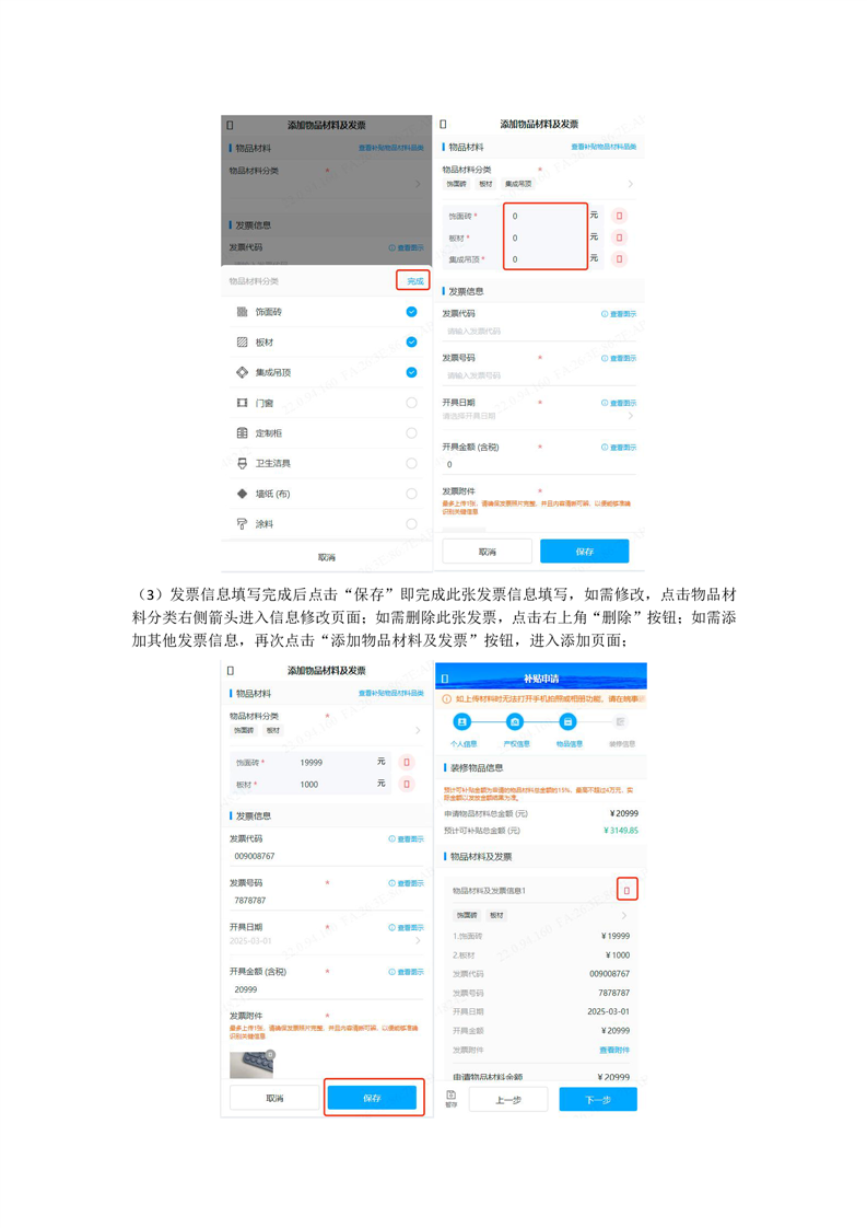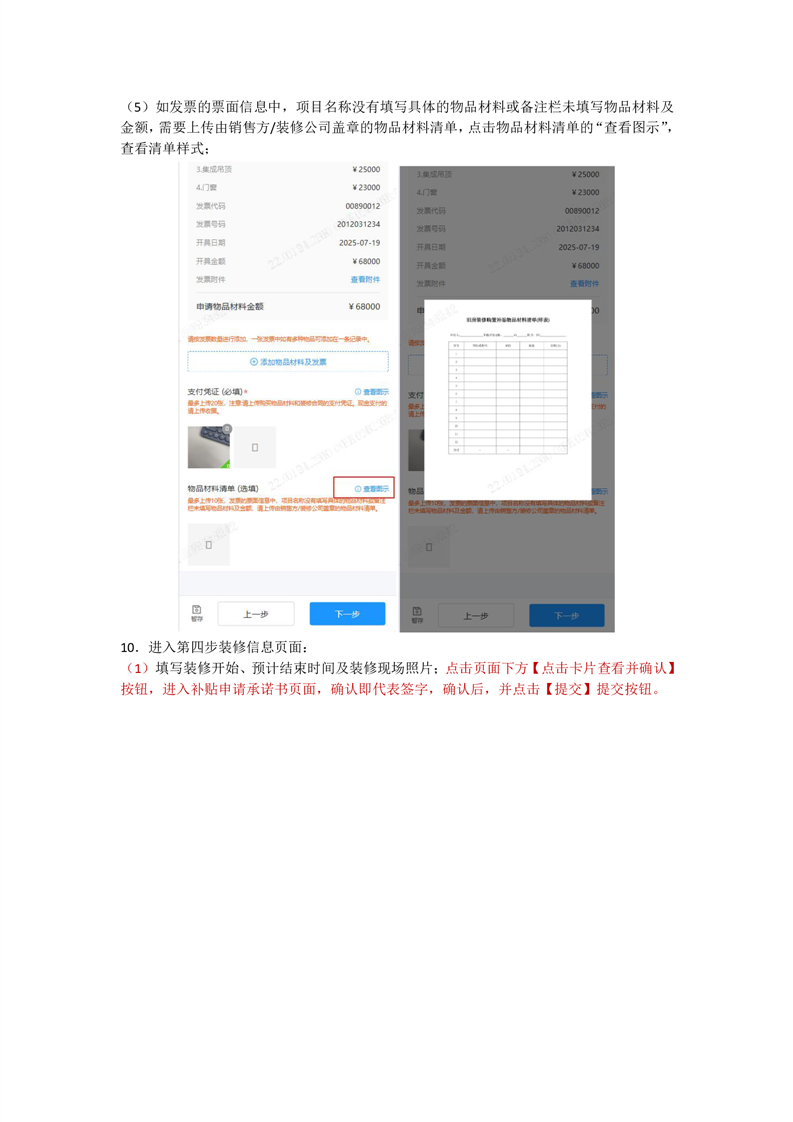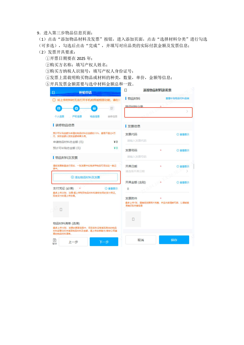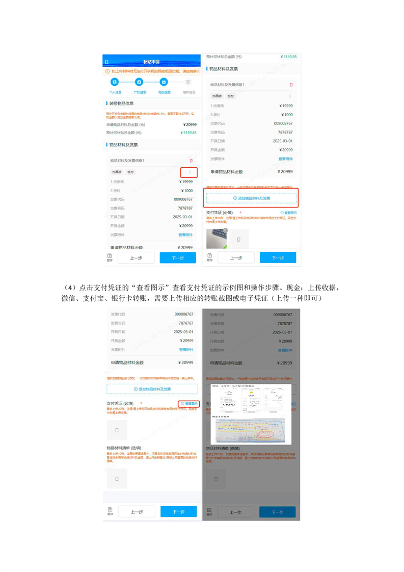 (一)先购后补。申请人先行完成相关物品和材料购置,在装修开工并形成实物工作量后即可向县区住建房管部门提交补贴资金申请。