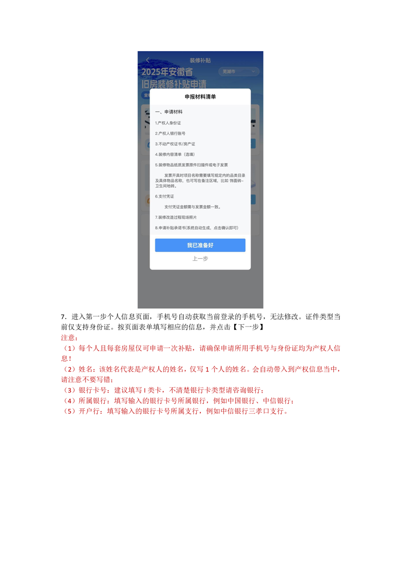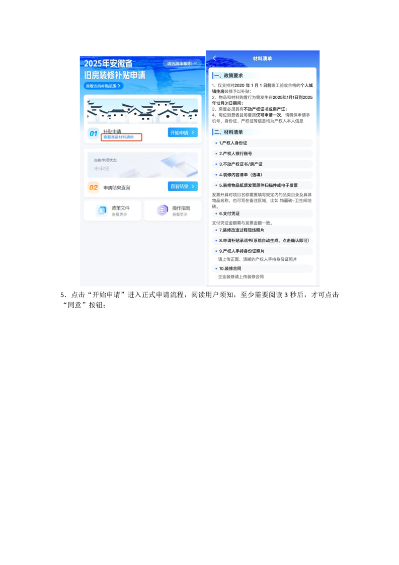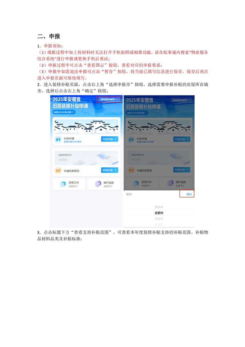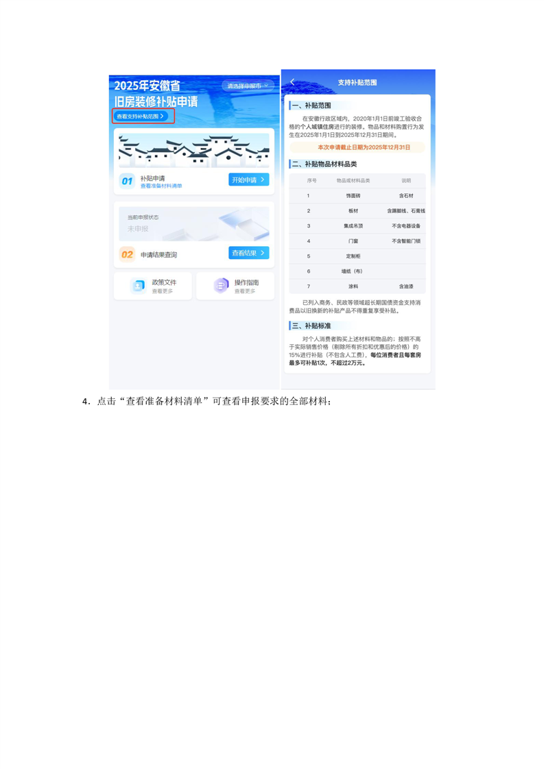 (一)提出申请。申请人登录通过“安徽省住房和城乡建设厅”官方公众号平台,依次进入“微互动”—“话说物业”—“旧房装修补贴”模块或者登录皖事通APP,搜索“旧房装修补贴”,按照系统提示如实填写或上传申请资料。本细则自发布之日起施行,申请人应对提交资料的真实性、完整性负责,申请日期截止2025年12月31日。