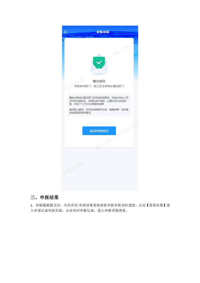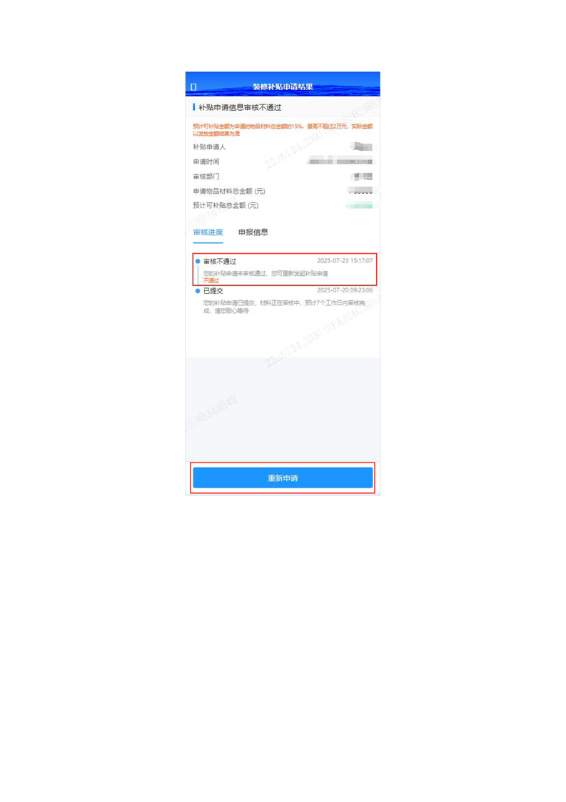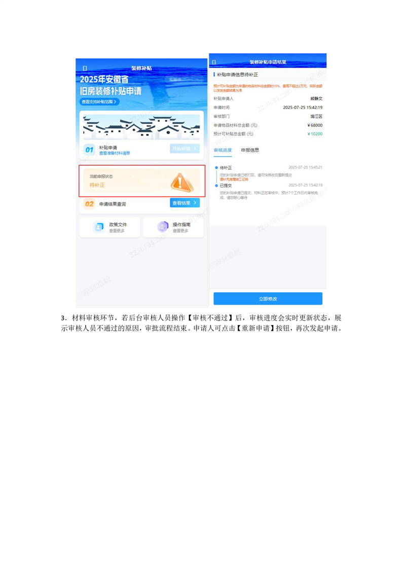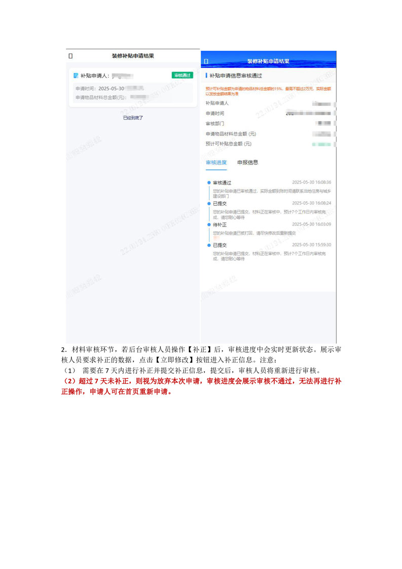 申请人提交申请后,县区住建房管部门应在5个工作日内完成资料审核。审核通过的,在旧房装修补贴监管系统及时进行提交,并在属地人民政府官方网站进行公示,且不少于5日;审核不通过的,退回申请并告知申请人具体原因,申请人按要求在7日内补正后重新提交申请。