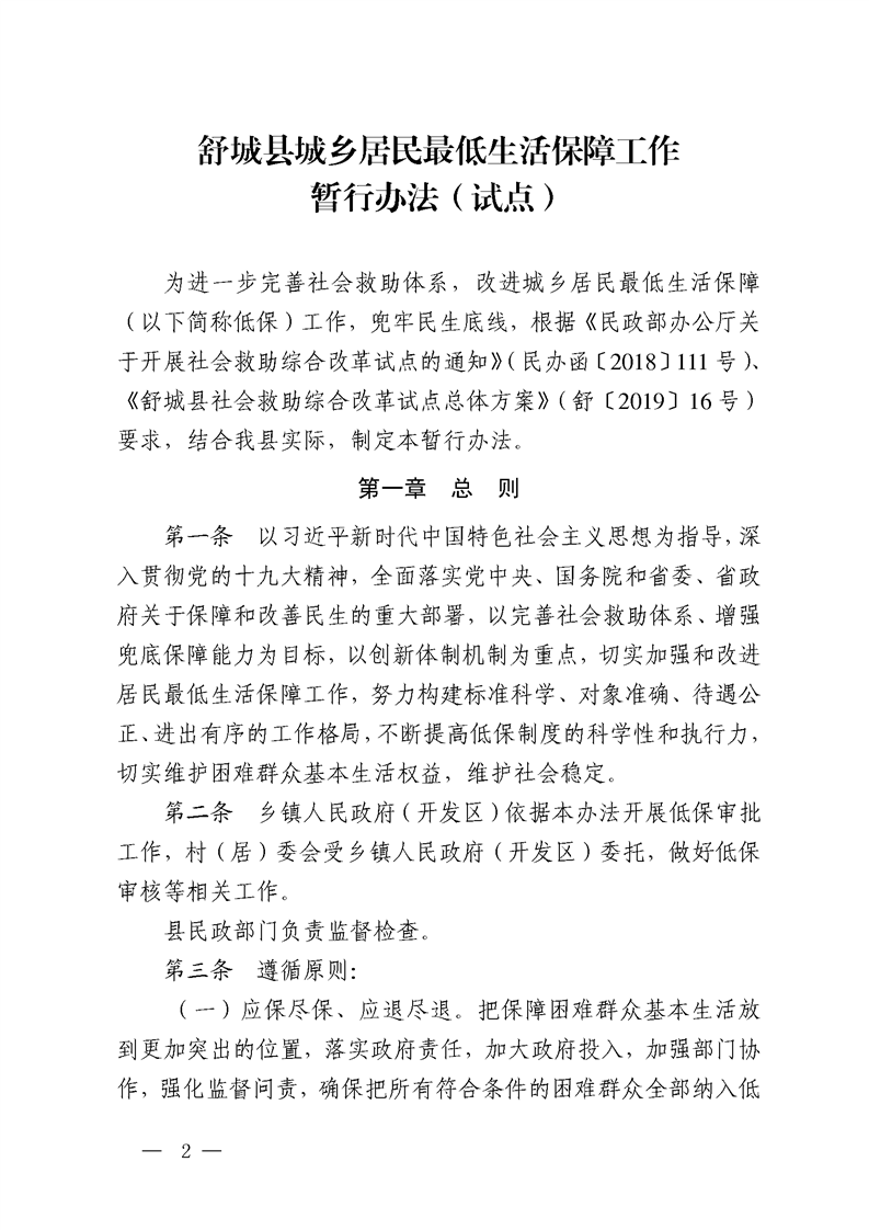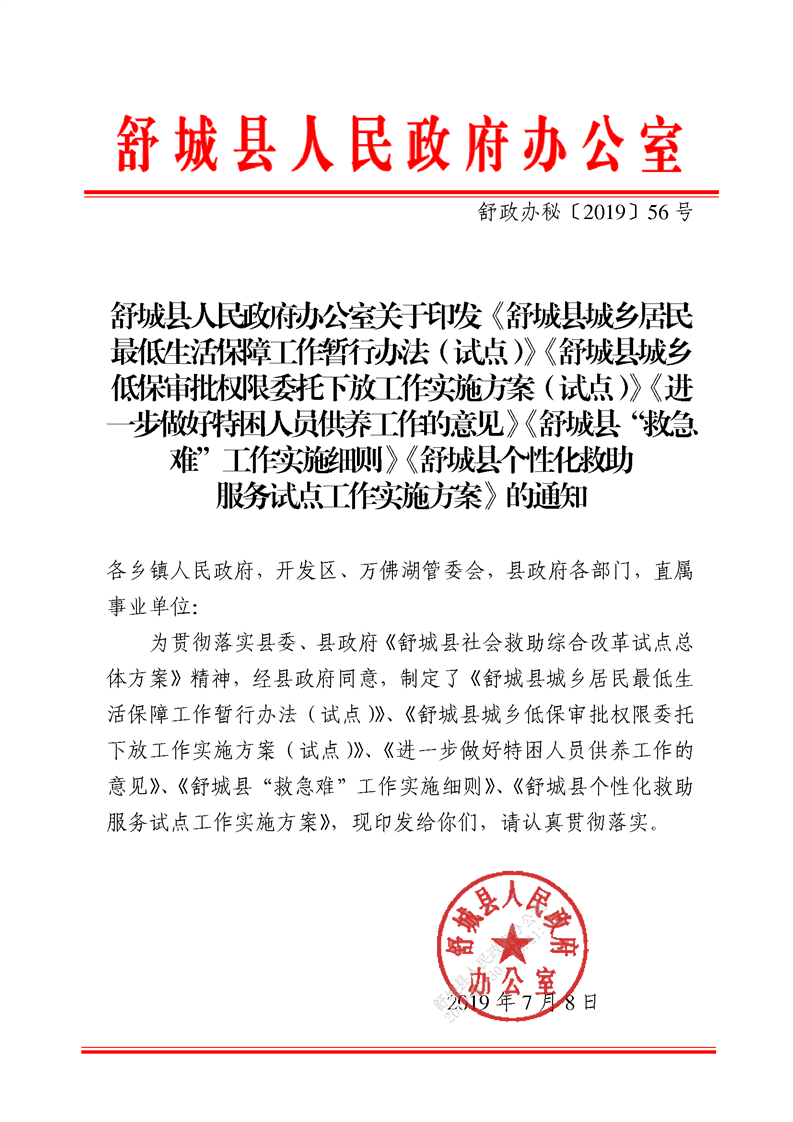 舒城县人民政府办公室关于印发《舒城县城乡居民最低生活保障工作暂行办法(试点)》《舒城县城乡低保审批权限委托下放工作实施方案(试点)》的通知