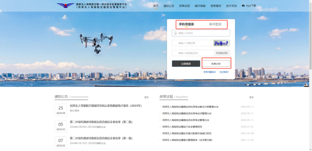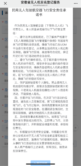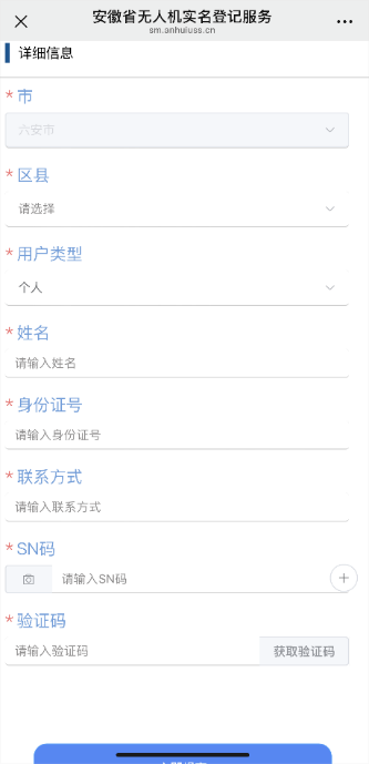 (二)进入安徽省低空管理与服务平台界面,手填无人机SN码(可扫描识别)、持有人姓名、身份证号、联系方式、所在地区等内容,短信验证后即可完成管理服务登记流程。