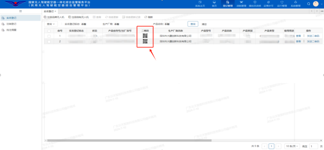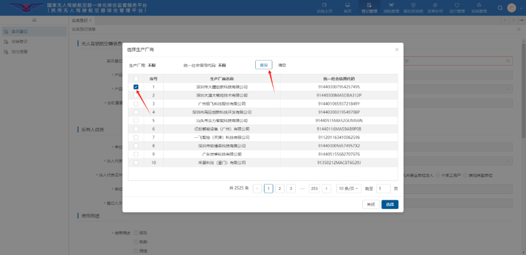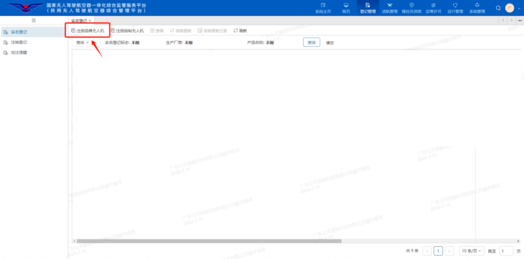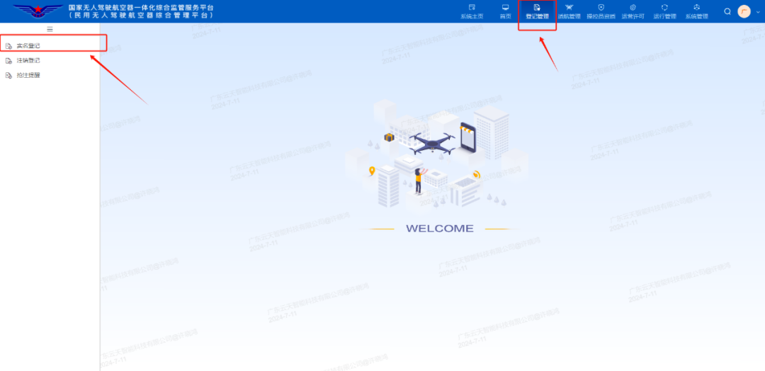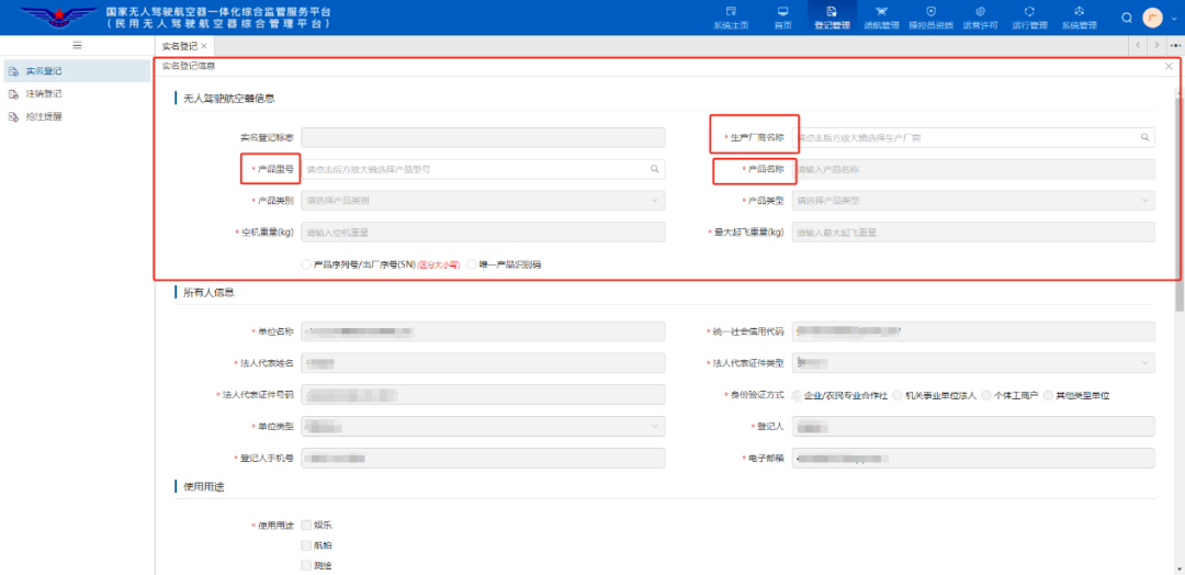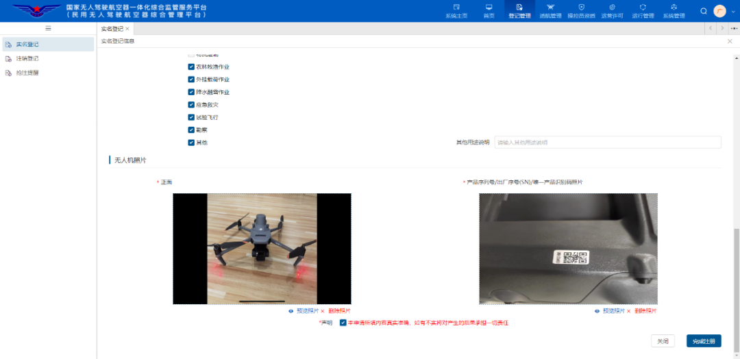 2.电脑端:进入平台首页,点击右上角登记管理,选择“实名登记”,注册品牌无人机、验证所有人等信息后,手机扫码刷脸验证,进行选择生产商名称,选择型号等相关信息(序列号需手动输入),根据要求上传照片。