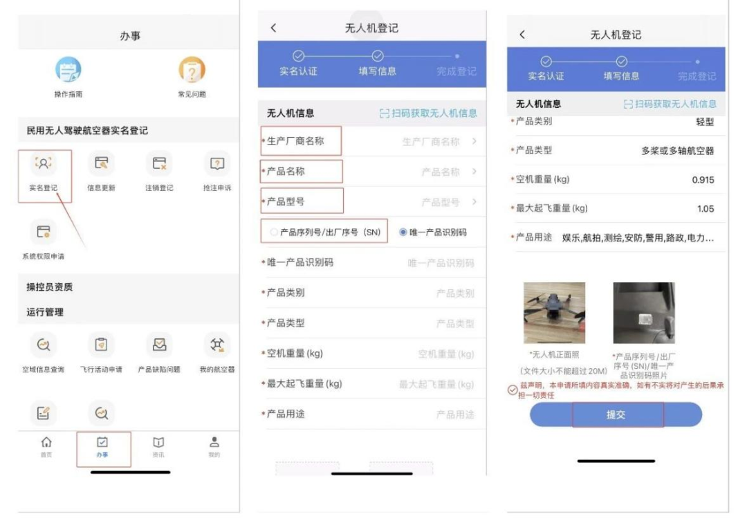 1.手机端:进入UOM手机端,选择底部办事栏中实名登记,根据提示跳转微信小程序进行人脸识别,返回APP进入无人机登记界面,按照要求填写生产厂商名称、产品名称、产品型号、SN码等信息后,点击提交完成登记。