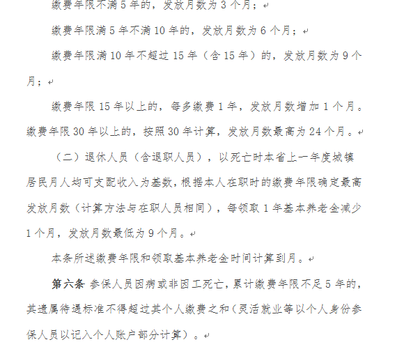 2.丧葬补助金的标准,按照参保人员死亡时本省(自治区、直辖市,以下简称本省)上一年度城镇居民月人均可支配收入的2倍计算。3.抚恤金标准按以下办法确定: