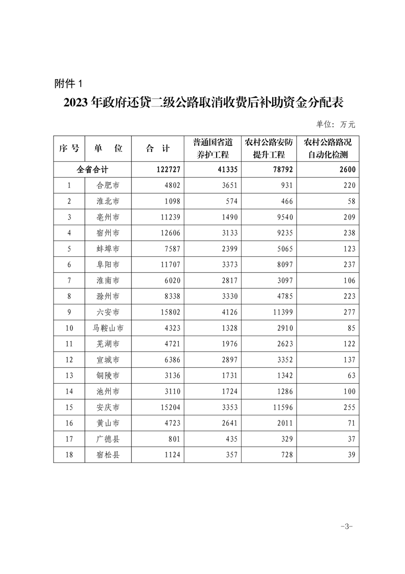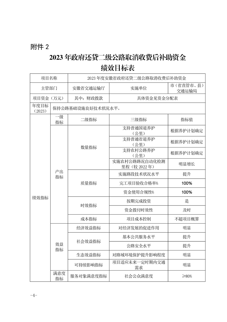 安徽省财政厅安徽省交通运输厅关于提前下达2023年政府还贷二级公路 取消收费后补助资金预算的通知
