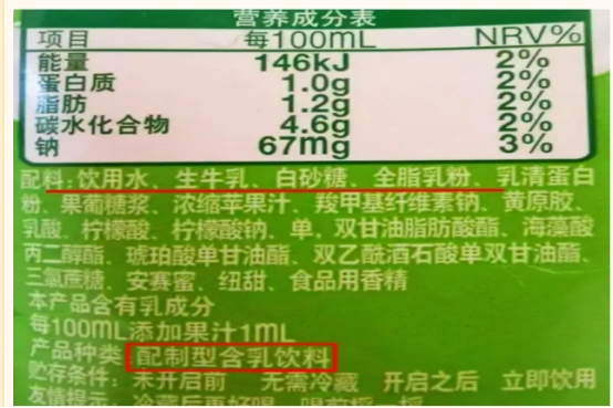 一看产品名称,若产品名称上有“饮料(饮品)”“乳味”等标识,则认为该产品不是乳制品。