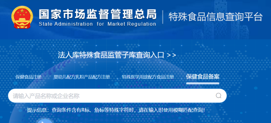 合法的保健食品:外包装上必须有市场监管总局(或原国家食品药品监督管理总局)批准的“蓝帽子”标志及批准文号。 图片来源:市说新语 保健食品产品注册备案信息可在市场监督管理总局网站(http://www.samr.gov.cn)查询,输入批准文号,核对产品名称、生产企业、保健功能等信息是否与实物一致。这是辨别产品合法身份最直接、最权威的途径。 图片来源:市场监管总局官网截图