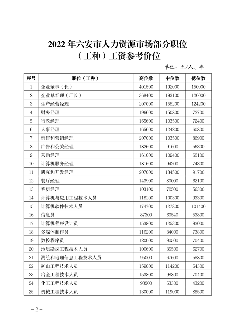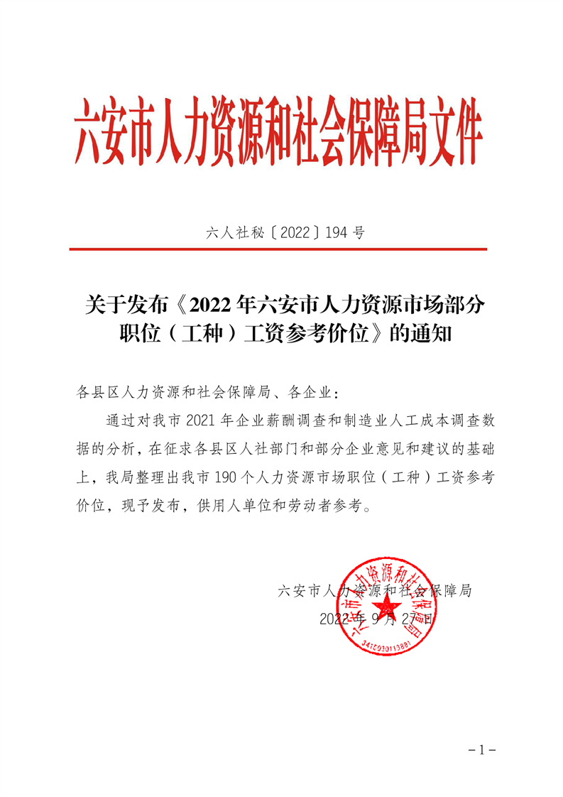 【市场工资指导价位信息发布】关于发布《2022年六安市人力资源市场部分职位(工种)工资参考价位》的通知 |