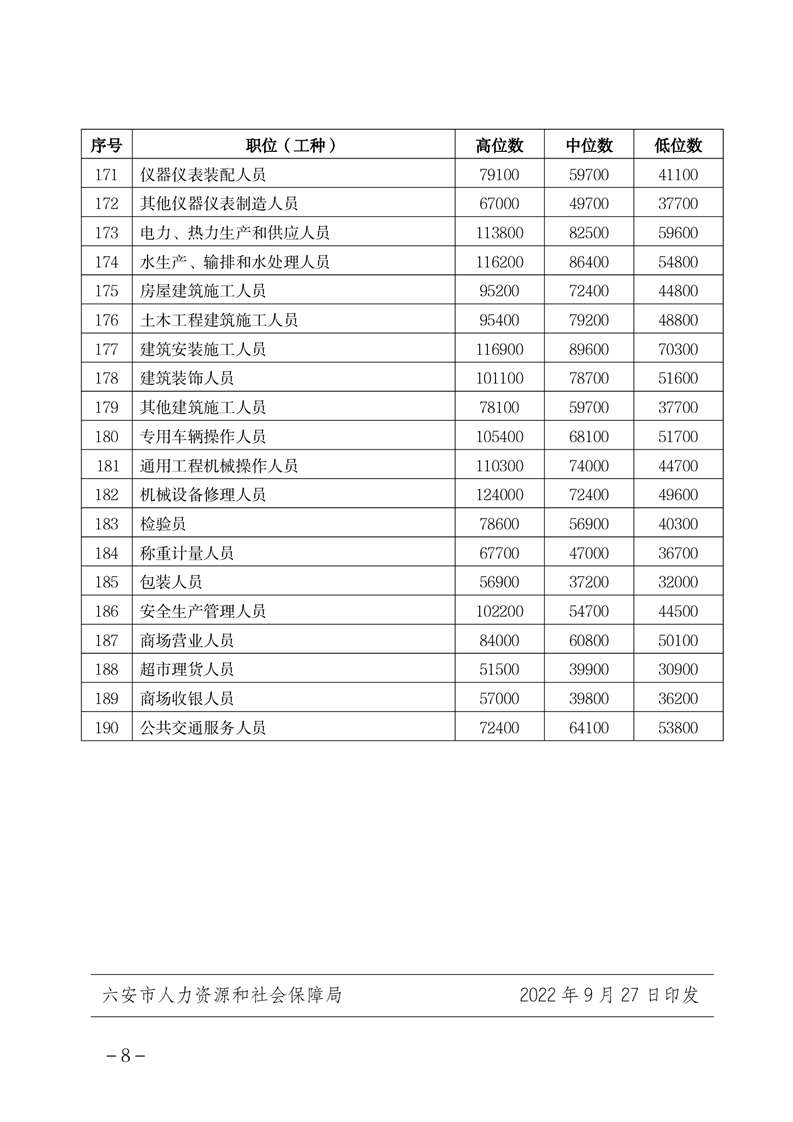【市场工资指导价位信息发布】关于发布《2022年六安市人力资源市场部分职位(工种)工资参考价位》的通知