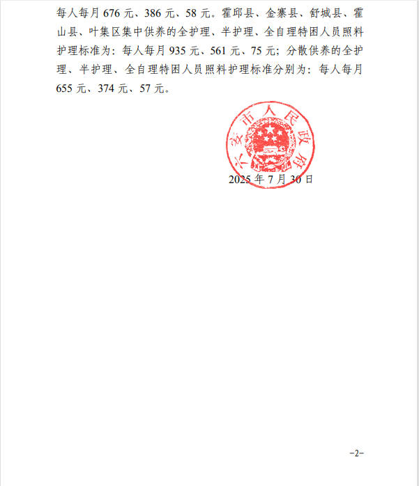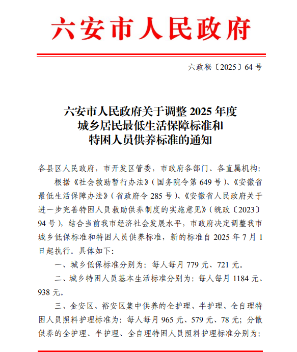 六安市特困人员救助供养标准 |