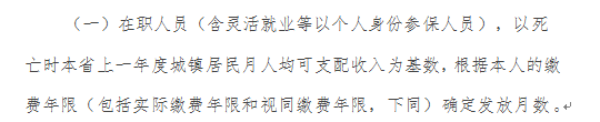 2.丧葬补助金的标准,按照参保人员死亡时本省(自治区、直辖市,以下简称本省)上一年度城镇居民月人均可支配收入的2倍计算。3.抚恤金标准按以下办法确定: