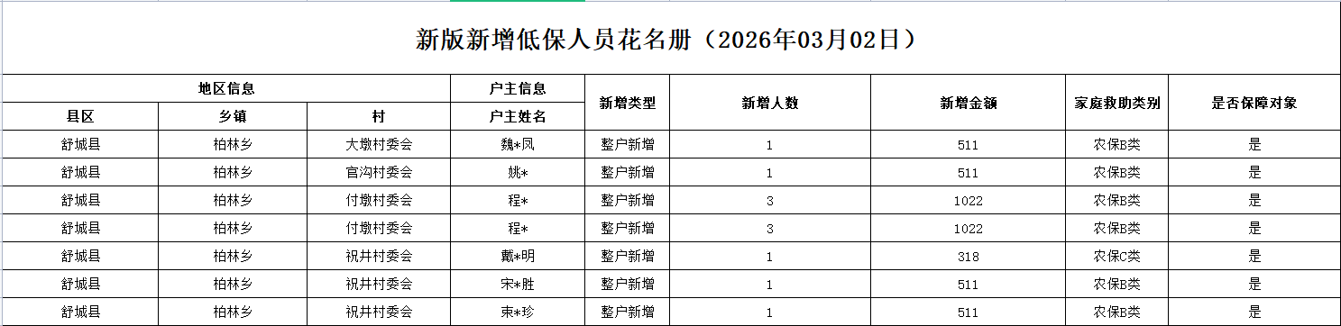 舒城县柏林乡2026年度1-2月新增低保人员信息 |