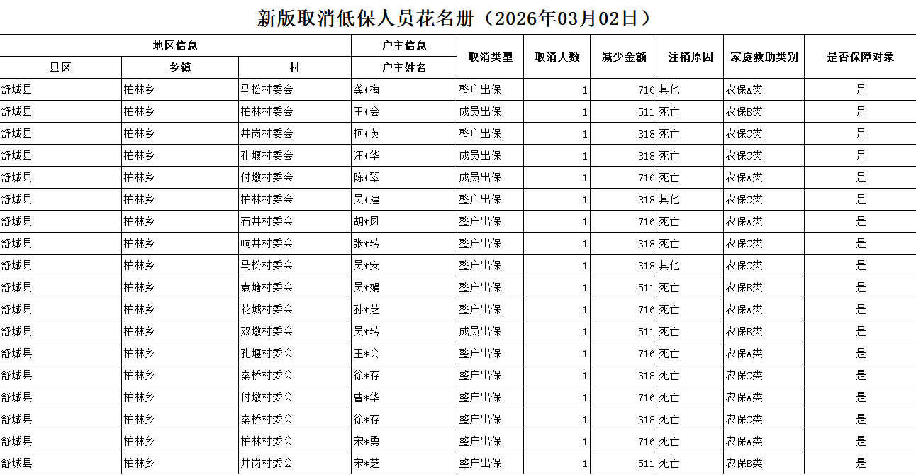 舒城县柏林乡2026年度1-2月退出低保人员信息