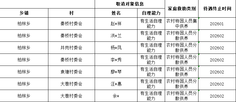 柏林乡2026年度1-3月退出特困供养人员名单 |
