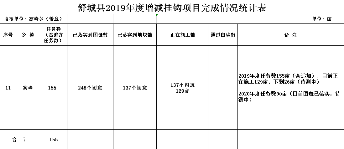 舒城县高峰乡2019年度增减挂钩项目完成情况统计表 |