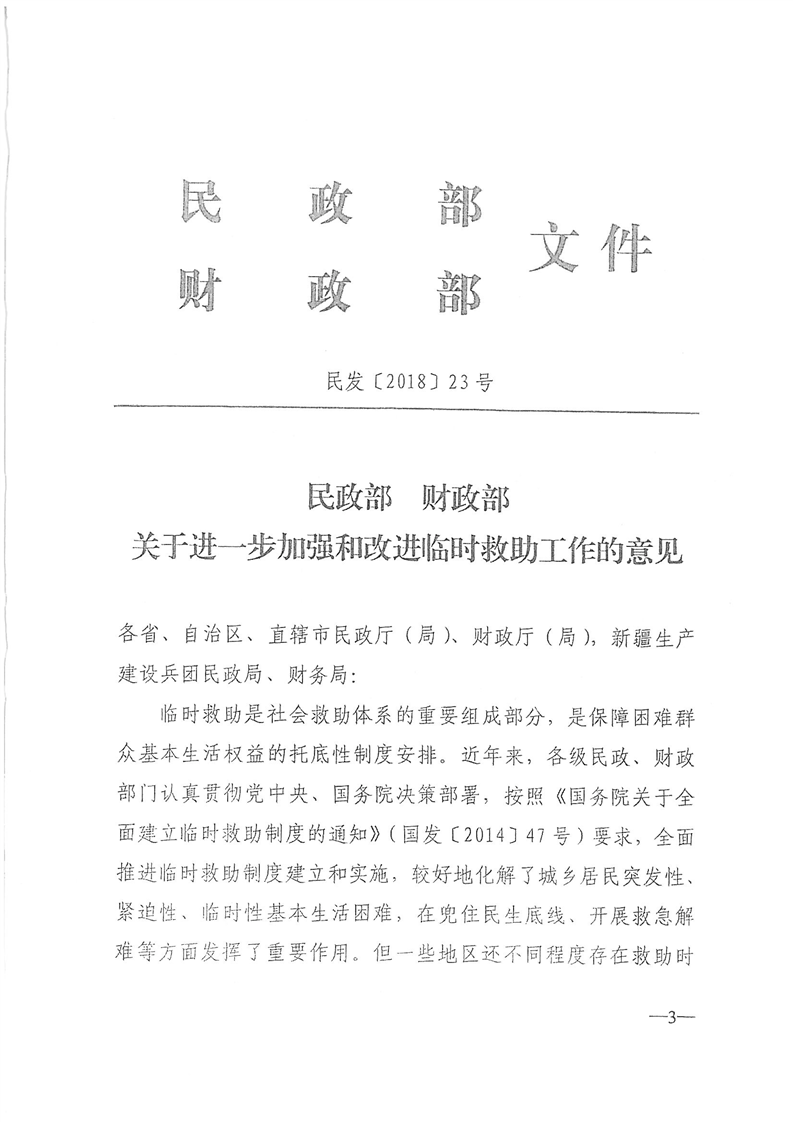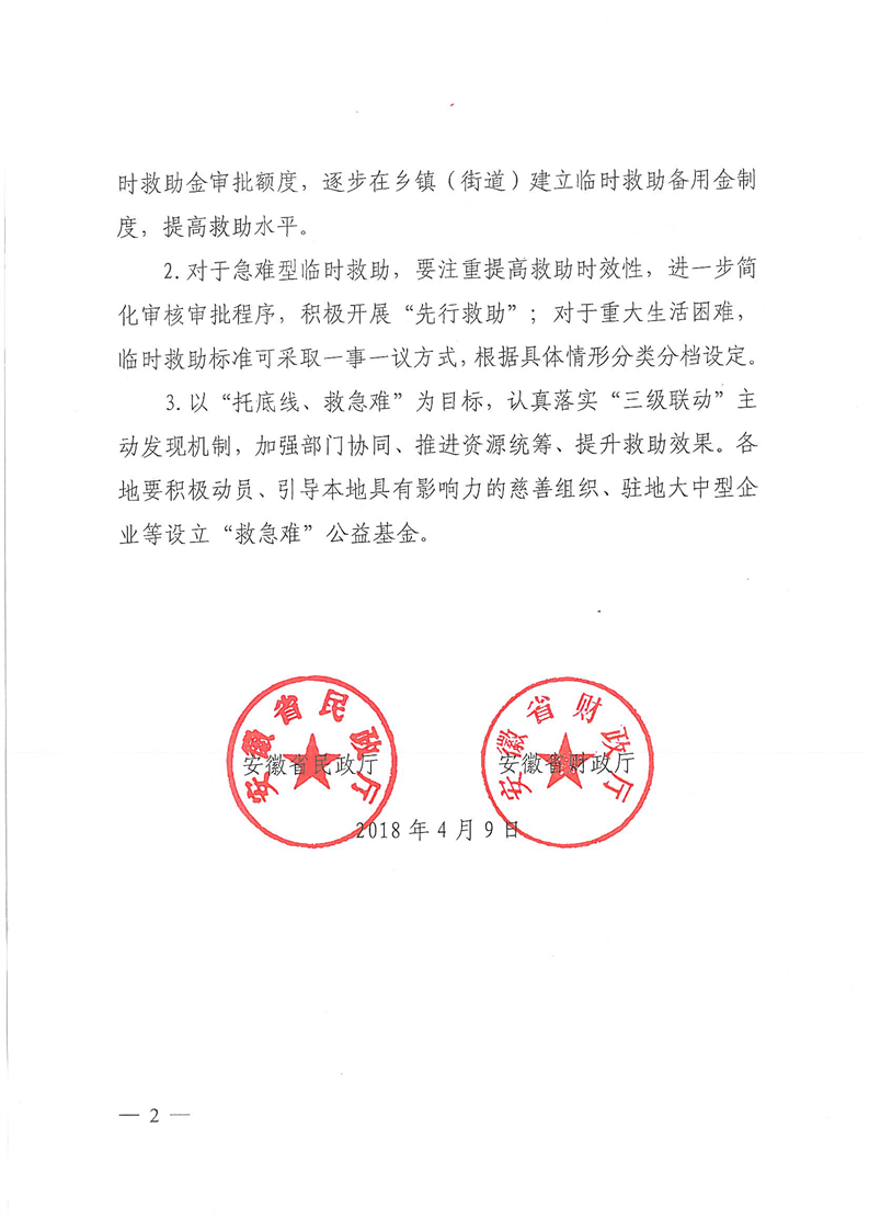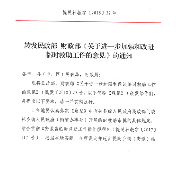 安徽省民政厅财政厅《转发民政部财政部<关于进一步加强和改进临时救助工作的意见>的通知》(皖民社救字〔2018〕32号)