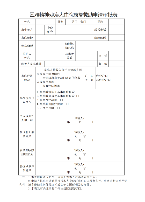 确定救助对象。凡符合救助条件的贫困精神残疾人,经本人或法定监护人提出书面申请,居(村)民委员会或社区精防医师推荐,填写《贫困精神残疾人住院医疗救助项目申请表》,经乡镇/街道审核符合条件后,上报县区残联审批并下发《六安市贫困精神残疾人住院医疗救助住院通知单》。每份《六安市贫困精神残疾人住院医疗救助住院通知单》限1名救助对象,一次使用,半年内有效。