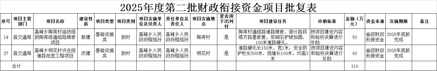 2025年第二批财政衔接推进乡村振兴补助资金项目公示公告(含高峰乡)