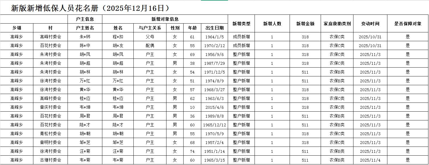 舒城县高峰乡2025年第四季度低保补助新增人员花名册 |