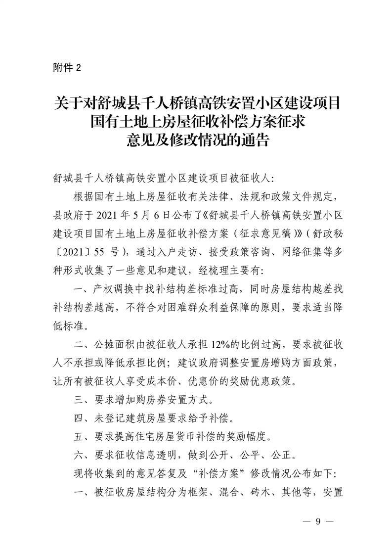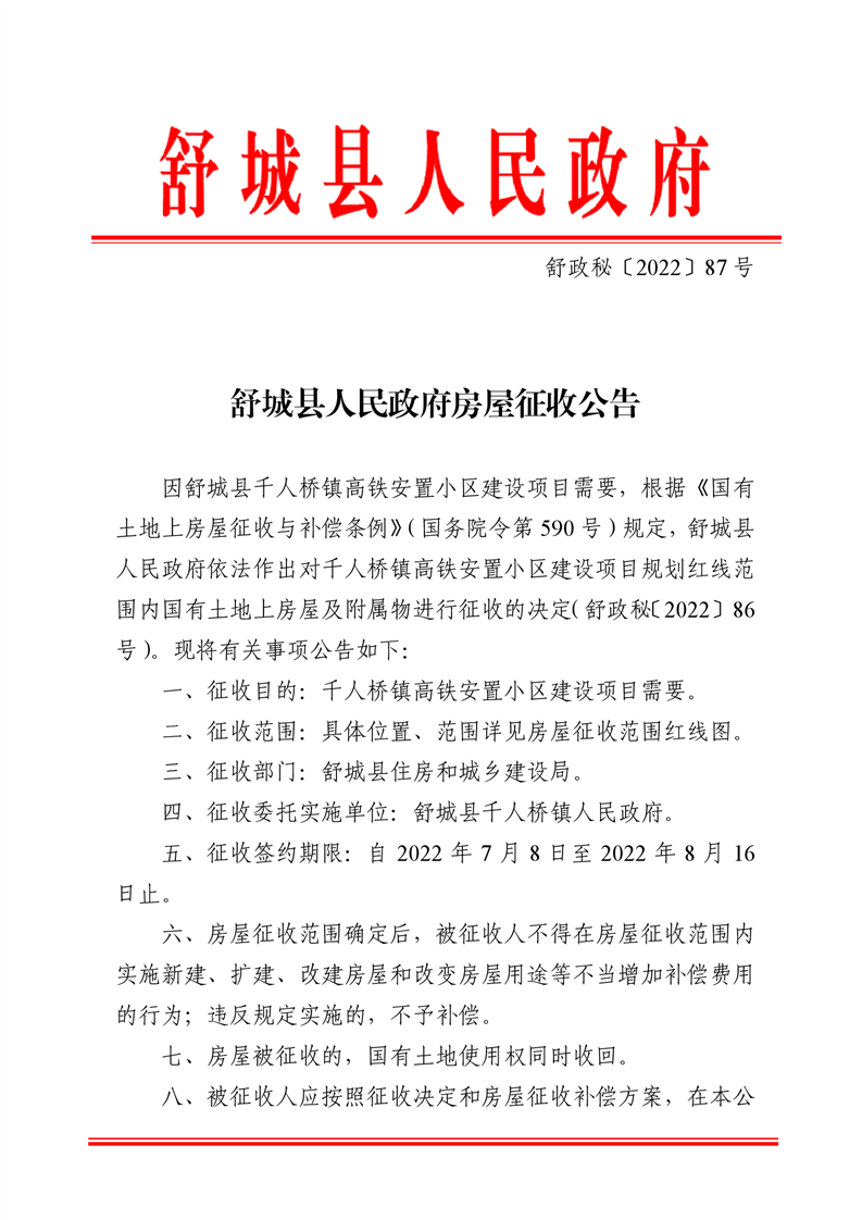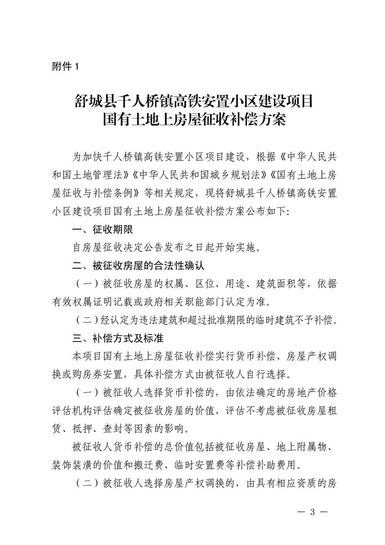 舒城县人民政府房屋征收公告(千人桥镇高铁安置小区建设项目国有土地上房屋征收补偿方案)(含方案修改情况信息)