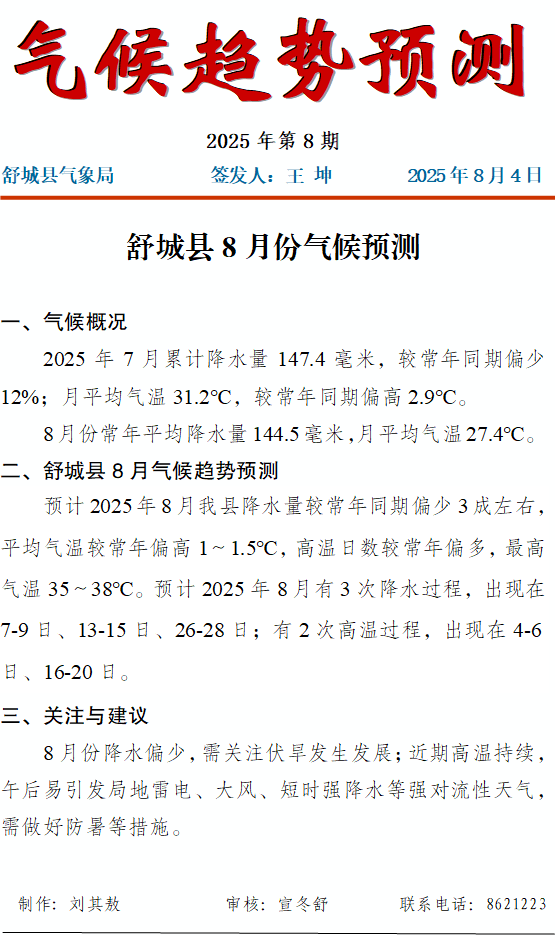 舒城县2025年8月份气候预测 |