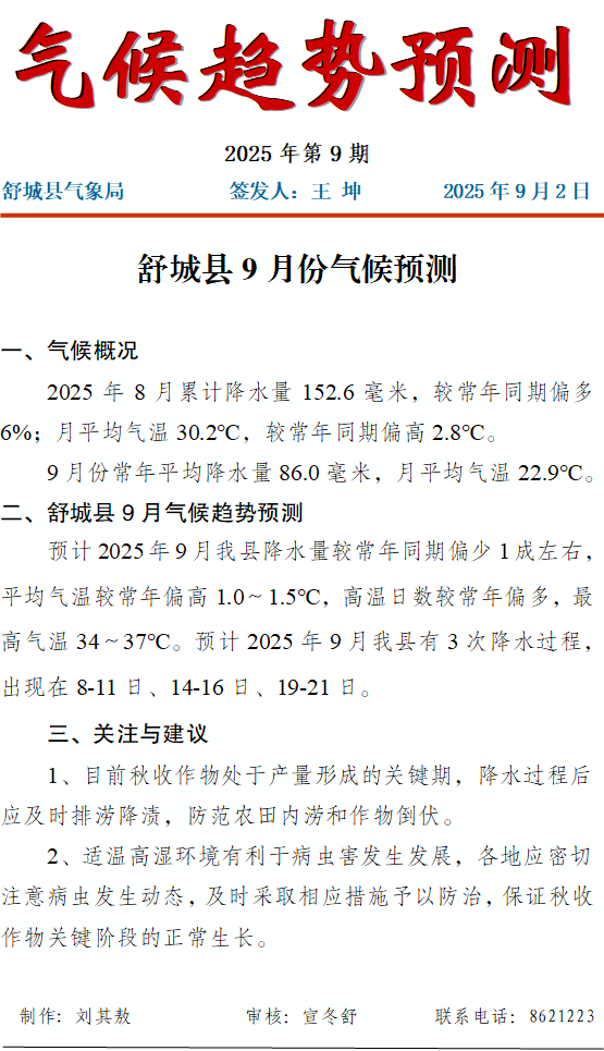 舒城县2025年9月份气候预测 |