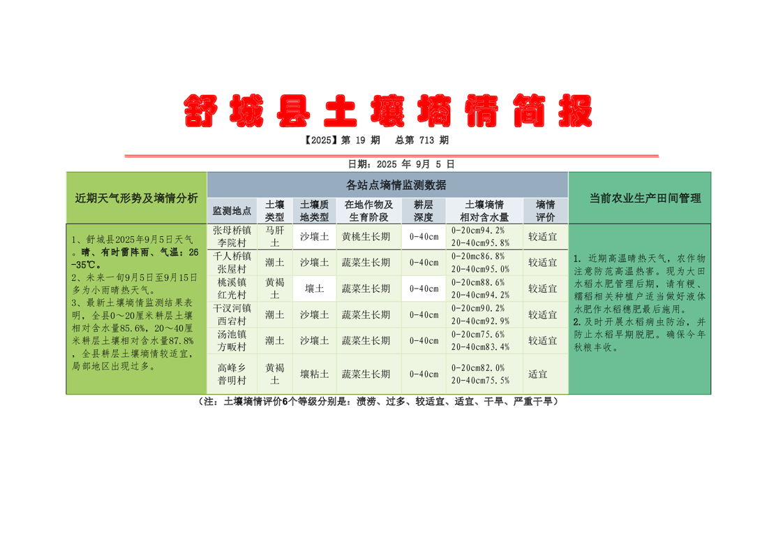 舒城县2025年9月5日土壤墒情监测统计情况表 |