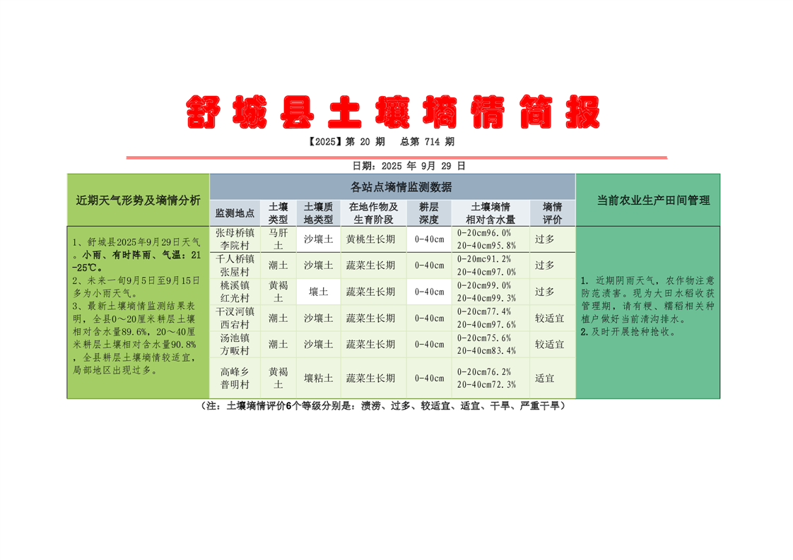 舒城县2025年9月29日土壤墒情监测统计情况表 |