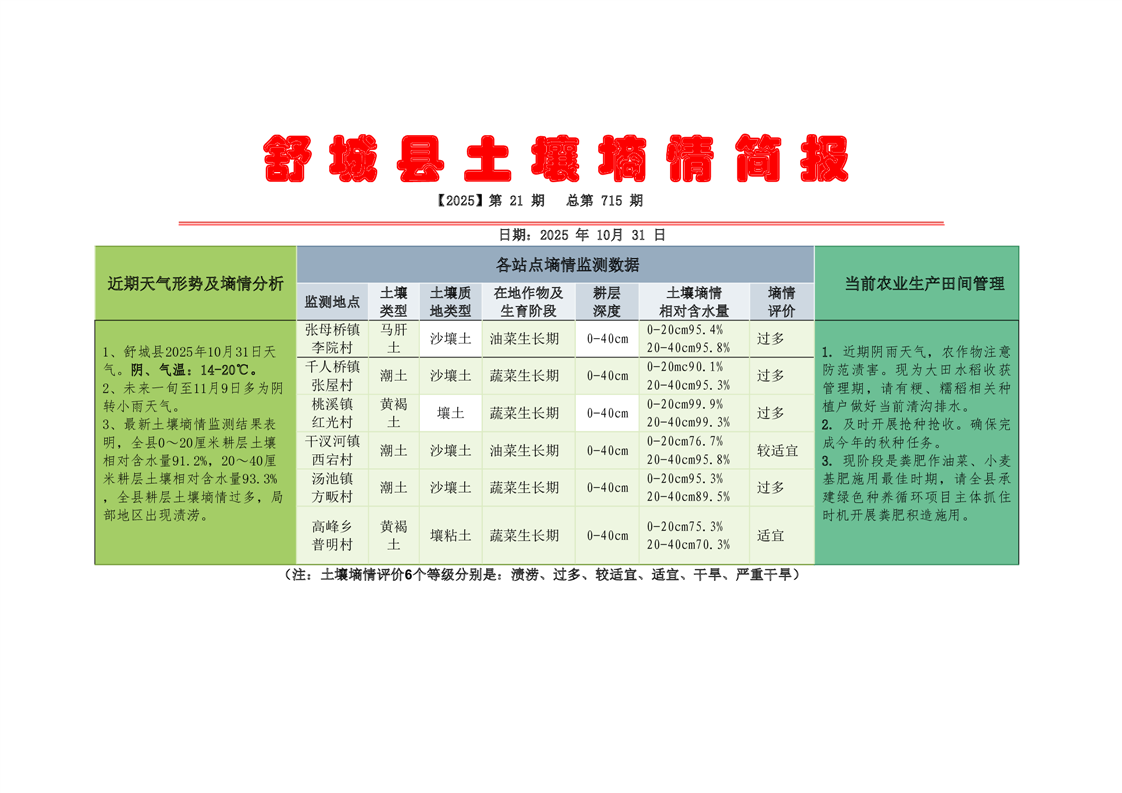 舒城县2025年10月31日土壤墒情监测统计情况表 |