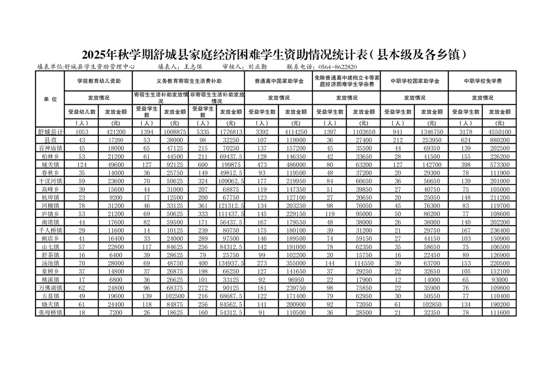 【资金投入和使用】2025年秋学期舒城县家庭经济困难学生资助情况统计表(县本级及各乡镇)