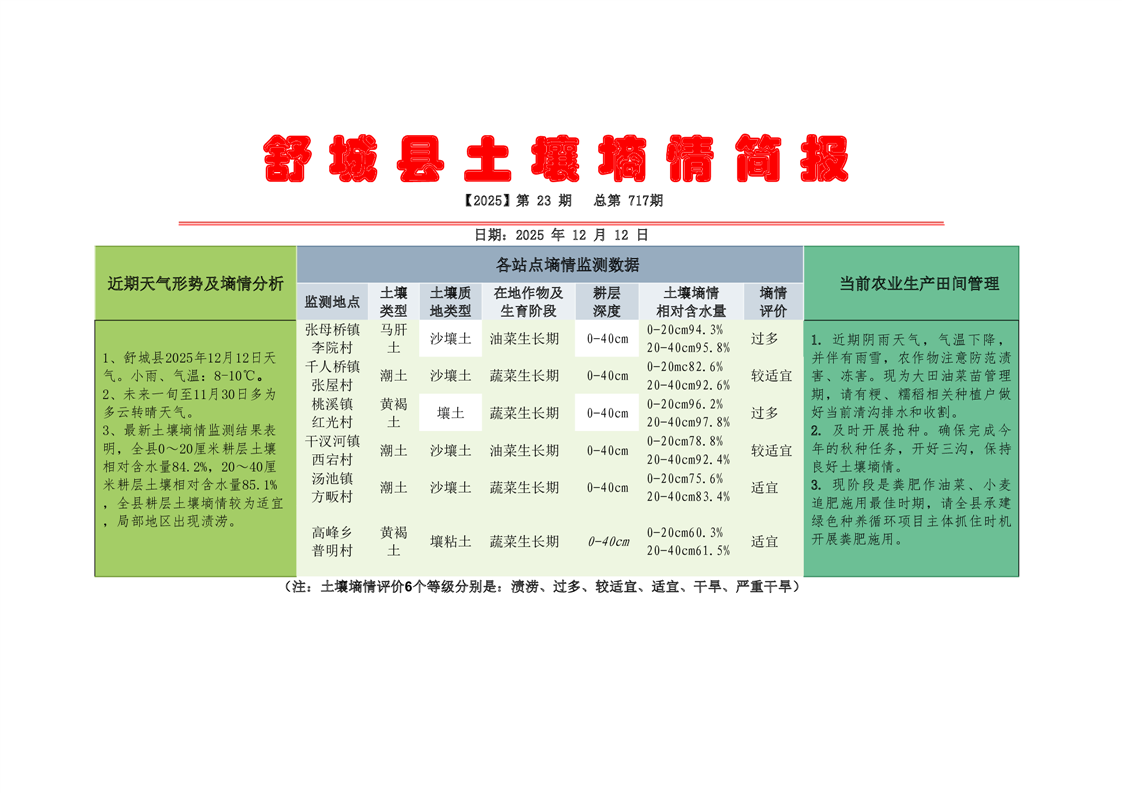 舒城县2025年12月12日土壤墒情监测统计情况表 |