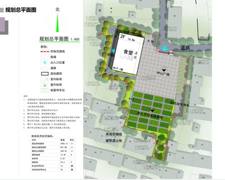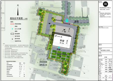 项目用地位于舒城县万佛湖九井村境内,G346南侧,总用地面积2905.27㎡。规划建设一栋2层食堂,总建筑面积约850㎡。现因现状条件限制,在方案中改变新建建筑位置,建筑的体量、体型、色彩不做改变。