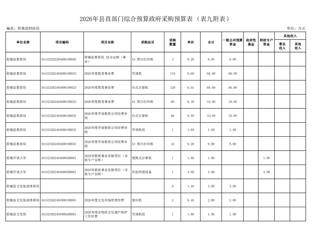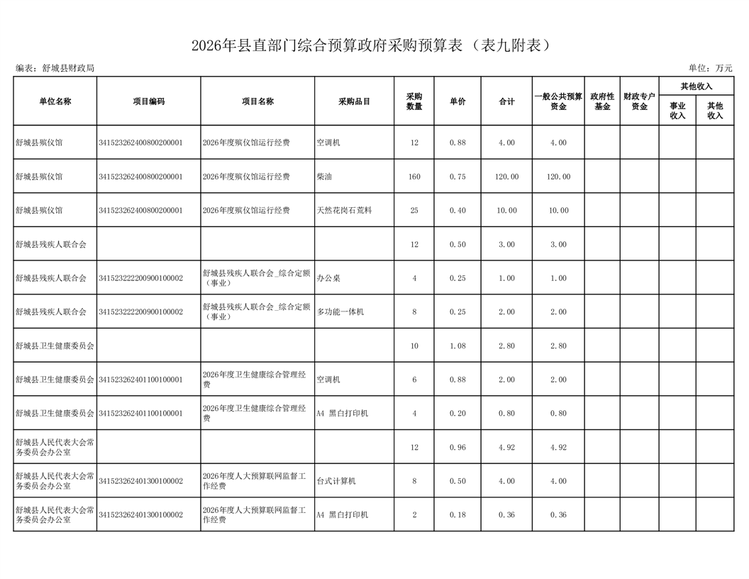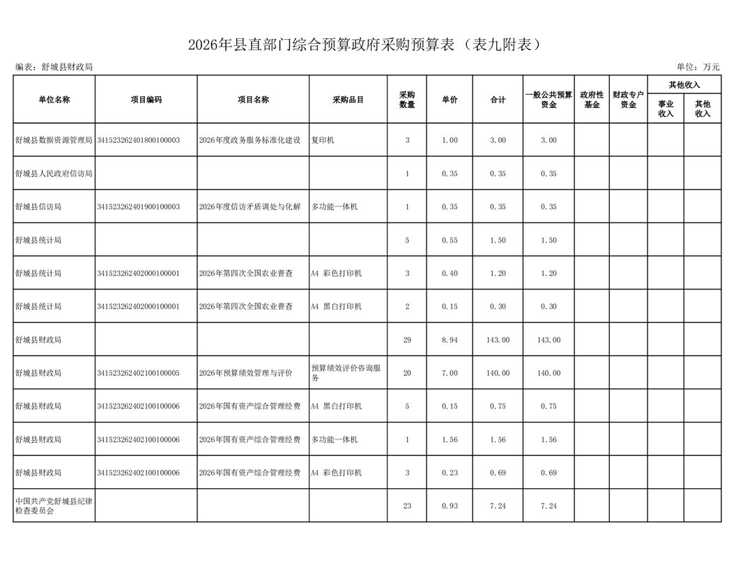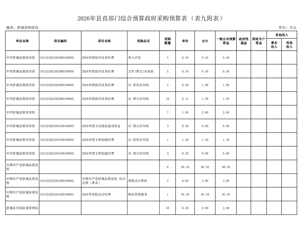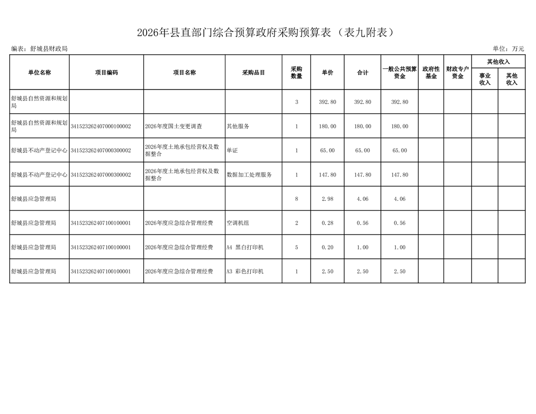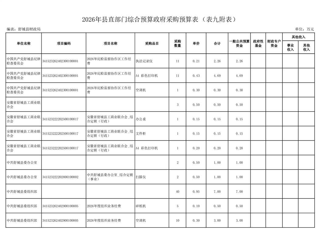 舒城县2026年县直部门综合预算政府采购预算表 |