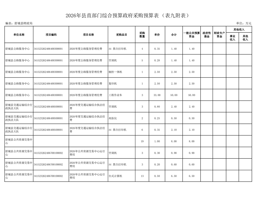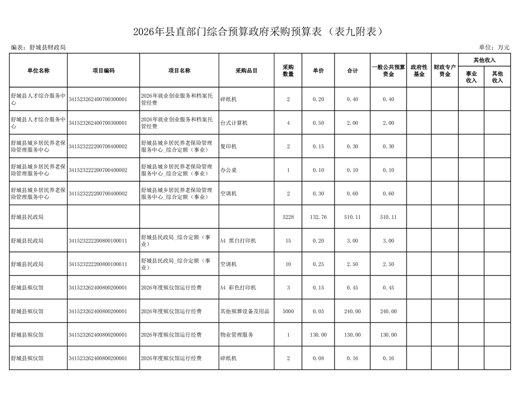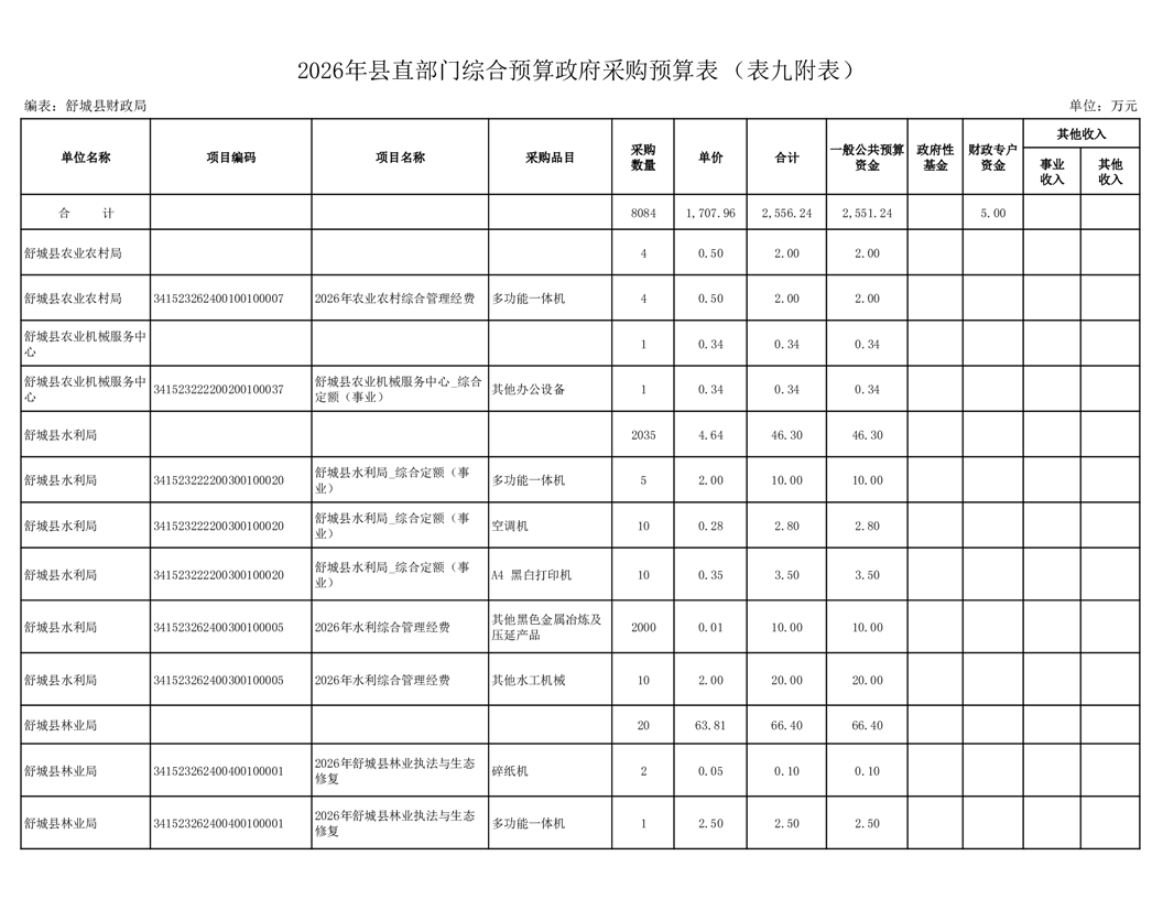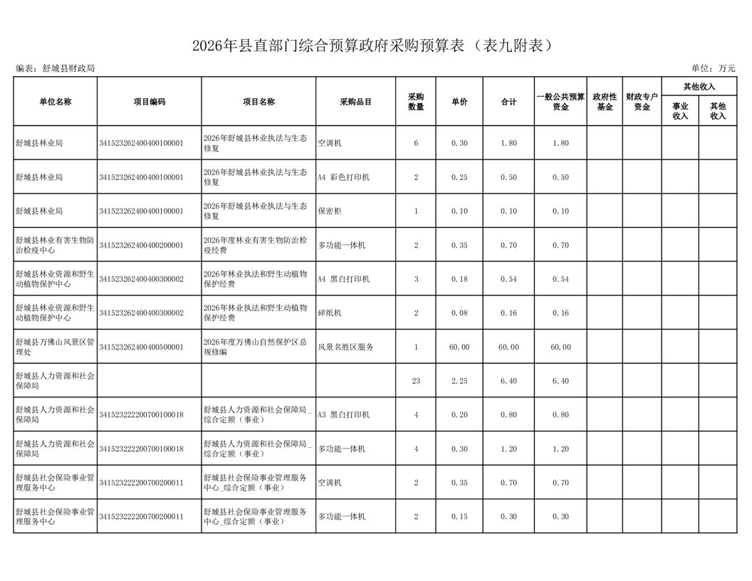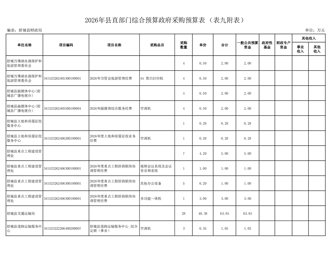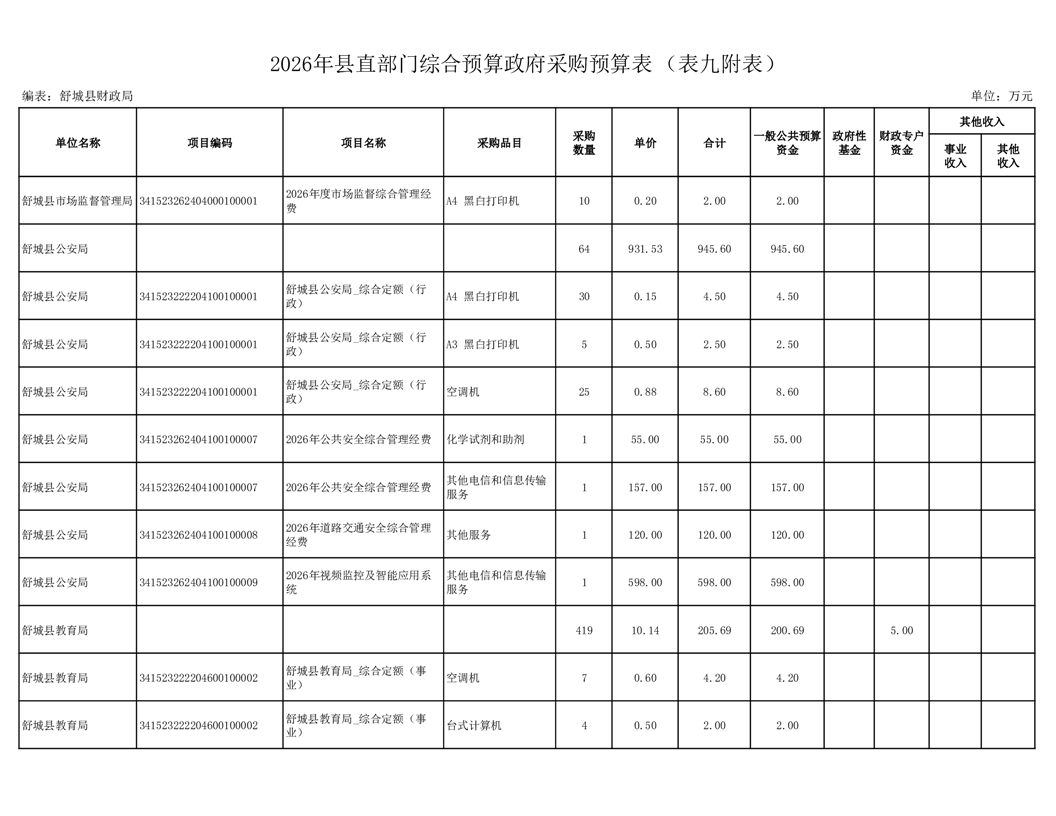 舒城县2026年县直部门综合预算政府采购预算表 |