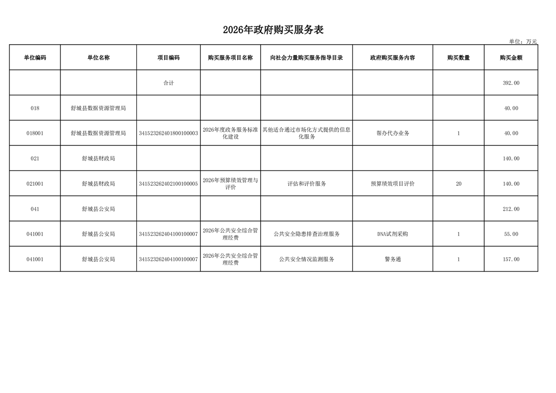 舒城县2026年县直部门综合预算政府购买服务预算表 |