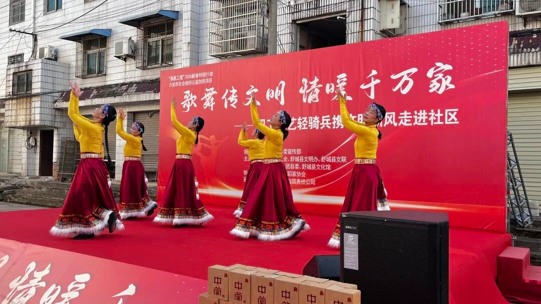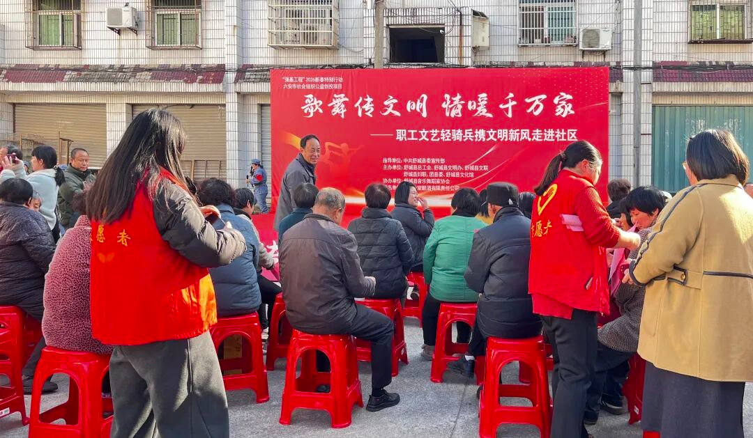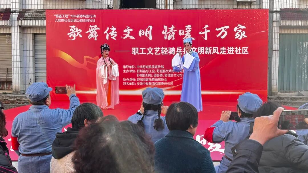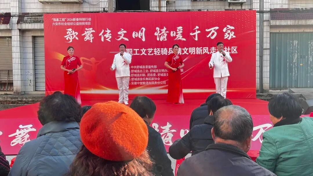 为展现文明创建成果、丰富社区居民精神生活,2026年1月14日下午3时,“歌舞传文明,情暖千万家”职工文艺轻骑兵携文明新风进社区活动在舒城县龙津桥社区舒城大市场温情启幕。这场由中共舒城县委宣传部指导,县文化馆、文明办、文联等多部门联合主办,安徽中堂酿酒有限责任公司冠名支持的文化盛宴,将艺术暖意与文明新风送到群众家门口。