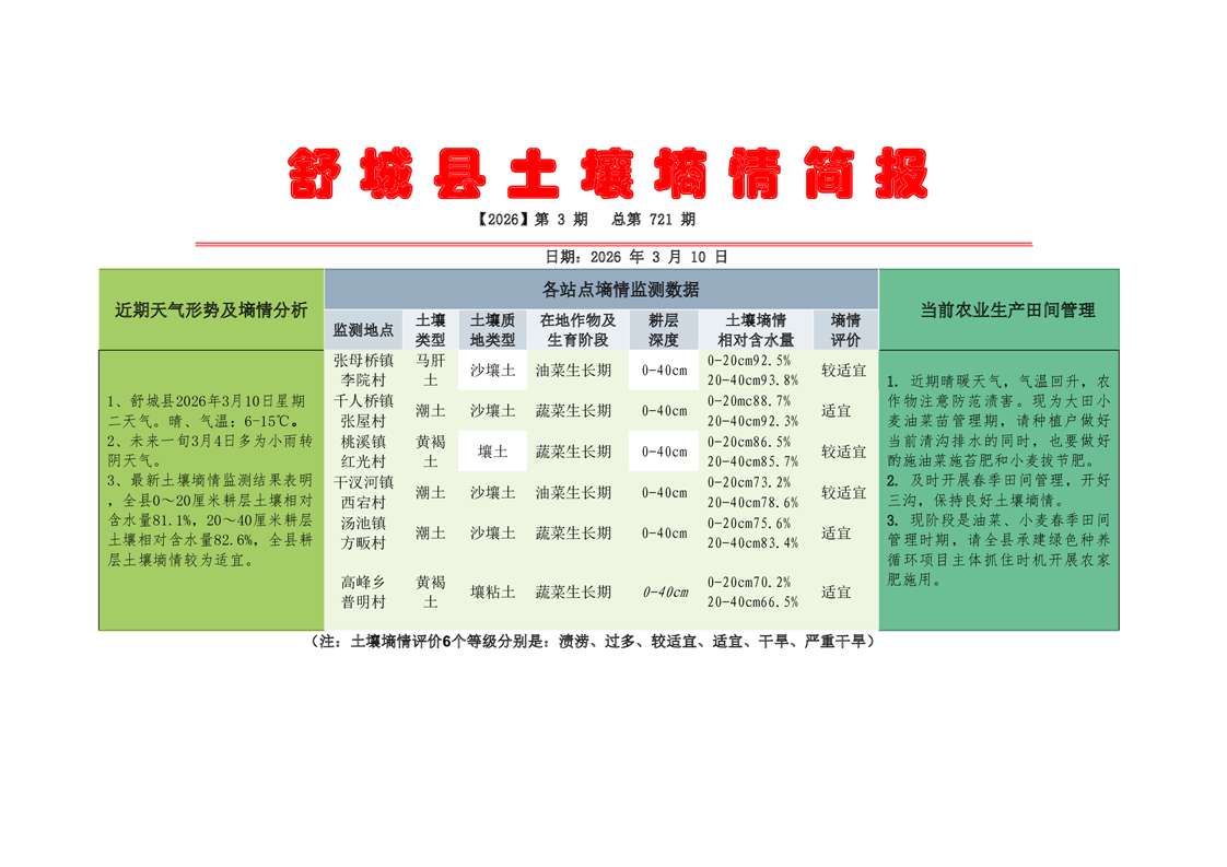 舒城县2026年3月10日土壤墒情监测统计情况表 |