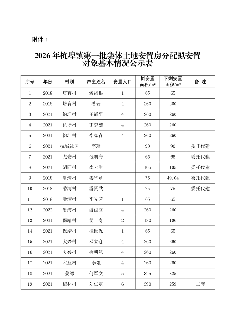 本次拟安置对象为杭埠镇域内所有下剩首套及五人以上二套房未分配的被征收安置户(不含五星村被征收安置户)。现将拟安置对象基本情况及安置房源予以公示,公示期为3个工作日(3月30日至4月1日):
