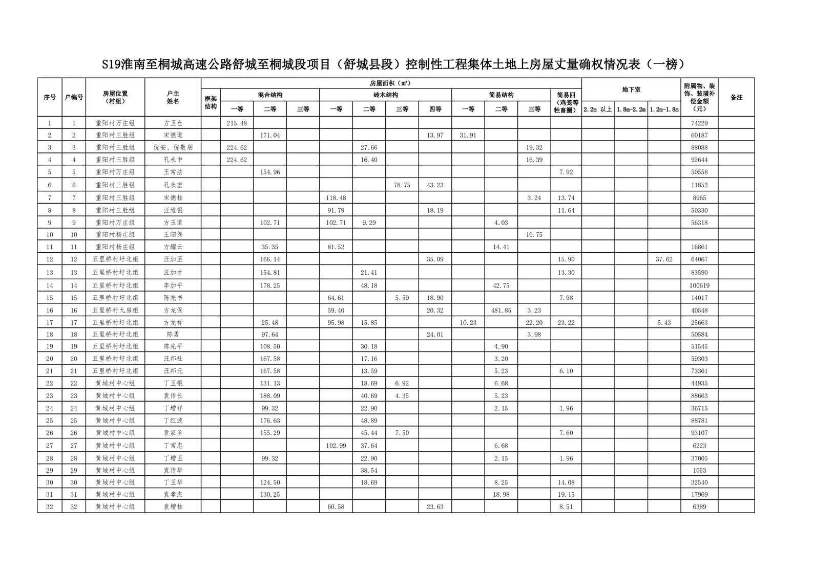附 件:S19淮南至桐城高速公路舒城至桐城段项目(舒城县段)控制性工程集体土地上房屋丈量确权情况表(一榜)